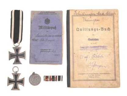 Konvolut Militaria Deutsch WK I. Zweimal EK 2, eine 3er Feldspange mit zwei Auszeichnungen, eine Medaille zum Andenken an den Weltkrieg. Dazu zwei nicht dazugehörige Büchlein, ein Militärpass sowie ein Quittungsbuch. Bitte selbst besichtigen.