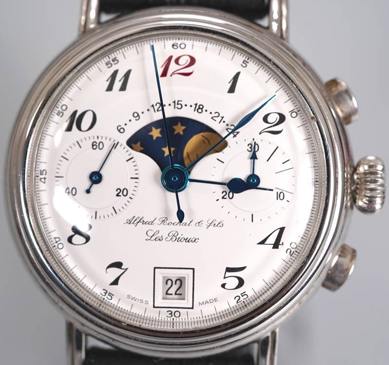 Alfred Rochat et fils Les Bioux. Chronoswiss, limitierte Auflage 373/500, Schweiz um 2000. Rundes Silbergehäuse und originales schwarzes Band. Chronographenwerk (Handaufzug, Kaliber V7734 M) mit kleiner Sekunde bei der Neun und Datum bei der Sechs. Mondphase mit 24-Stundenanzeige im oberen Bereich. Gebläute Zeiger. Zentrale Stoppsekunde, Minuten bei der Drei. Durchmesser ca. 38 mm. Uhrwerk und Chronographenfunktion sind gegeben. Insgesamt guter gebrauchter Zustand wie abgebildet. Werk nicht geöffnet. Originale Box vorhanden.
