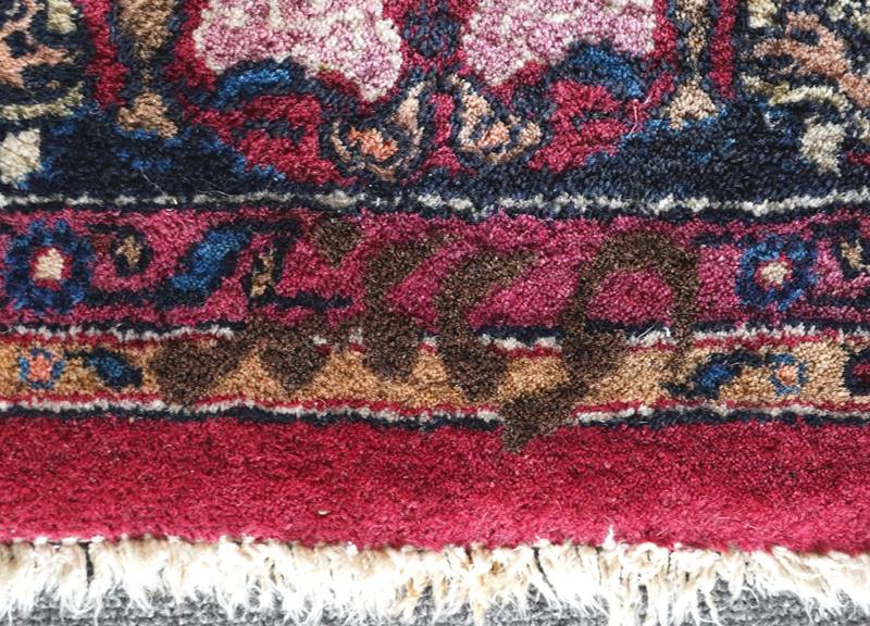 Mesched Mitte 20. Jh. Baumwolle/Wolle. Drei Bordüren mit floralen und figürlichen Szenen. Im cremefarbenen Innenfeld Jagdszenen mit Reitern und Wildtieren. Oben in der Mitte ungedeutete Signatur. Größe ca. 337 x 252 cm, ca. 6 x 5 = 30 Knoten/qcm. Altersbedingt guter Zustand wie abgebildet.