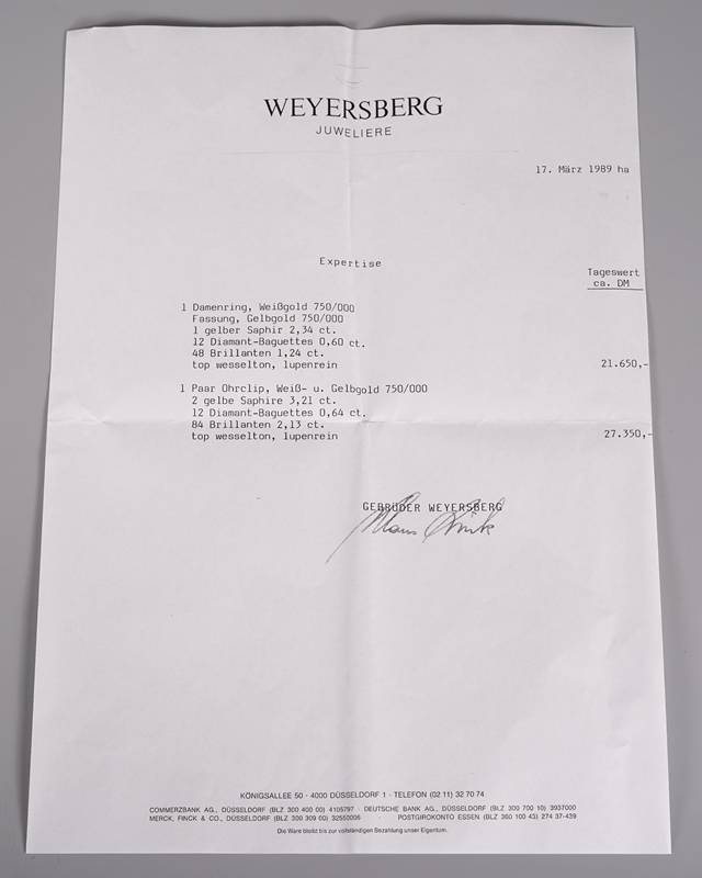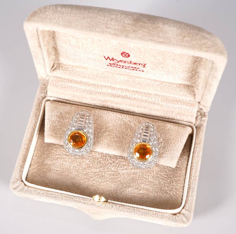 Deutsch 1980-er Jahre. Weißgoldfassung und zwei facettierte gelbe Saphire von zusammen 3,21 Carat in Gelbgoldfassung, je Gold 750. Zusammen 12 Diamantbaquetten von 0,64 Carat und 84 Brillanten von zusammen 2,13 Carat, TW, lupenrein. Größe ca. 22 mm, Gewicht zusammen ca. 12,9 Gramm. Schöner Zustand. In der vorigen Nummer wird der passende Ring angeboten. Die Gewichte und und die weiteren Merkmale wurden von der beiliegenden Expertise der Juweliere Weyersberg, Düsseldorf aus dem Jahr 1989 übernommen.