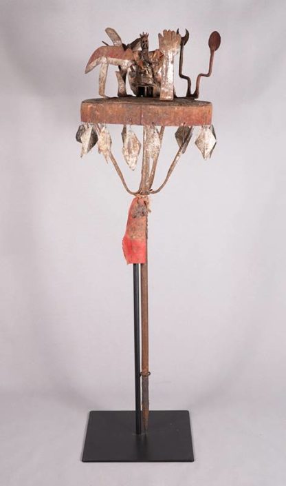 Quidah, Benin, Volk der Fon. Metall. Runde Plattform auf spitzem Stab, daran rautenförmiger Dekor, darauf zentrale Figur umgeben von verschiedenen Formen, wie Chamäleon und Hand. Durchmesser der Plattform ca. 29 cm. Höhe ca. 93 cm. Auf Metallsockel montiert. Provenienz: 9. Tribal-Art Auktion Kunstauktionshaus Zemanek-Münster 1996, Los 229. Wir machen darauf aufmerksam, dass dieser Gegenstand nicht aus Deutschland ausgeführt werden darf.