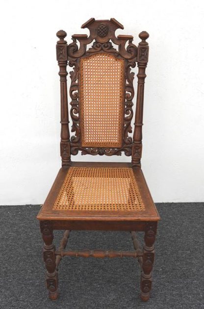 Sechs Gründerzeitstühle Deutsch 19. Jh. Wohl Eiche. Geschnitzt und gedrechselte Beine im Verbund, Lehne mit floralen Schnitzereien. Lehne und Sitzfläche mit Korbgeflecht. Größe ca. 48,5 x 53 cm. Höhe ca. 113 cm, Sitzhöhe ca. 48,5 cm. Starke Gebrauchsspuren, Geflecht teils beschädigt.