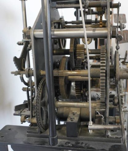 20. Jh. Geschwärztes Metallgestell mit oben aufgesetztem Uhrwerk mit Ankerhemmung, Pendel und Schlag auf zwei Glocken sowie einem Gewicht (ein weiteres fehlend). Elektrosteuerung (wohl passend) dabei. Größe ca. 55 x 36 cm, Höhe ca. 173 cm. Läuft an, Schlag löst nicht aus, wohl Teile fehlend. Funktion nicht geprüft, bitte selbst besichtigen. Kein Versand möglich, nur Abholung, wir empfehlen gerne eine Spedition.