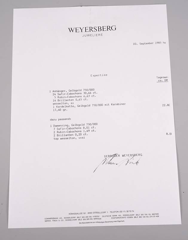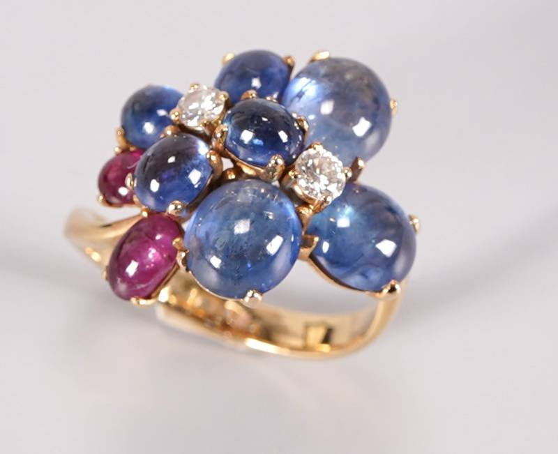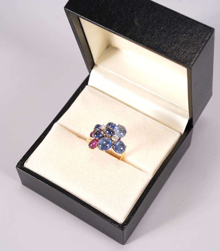 Deutsch 1980-er Jahre. Eleganter Ring mit in Gelbgold 750 gefassten Edelsteinen. 7 Saphircabochons von zusammen 8,01 Carat, 2 Rubincabochons von zusammen 1,49 Carat und 2 Brillanten von zusammen 0,2 Carat, TW, vvsi. Ringgröße ca. 55, Gewicht ca. 7,2 Gramm. Sehr schöner Zustand. In der vorigen Nummer wird der passende Anhänger angeboten. Die Gewichte und und die weiteren Merkmale wurden von der beiliegenden Expertise der Juweliere Weyersberg, Düsseldorf aus dem Jahr 1985 übernommen.