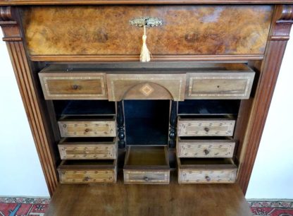 Deutsch 19. Jh. Nussbaum. Drei Frontschubladen und eine Kopfschublade. Hinter der Schrägklappe, reiches Innenleben mit mehreren Schubladen und einem Mittelfeld von ebonisierten Säulen gerahmt. Schöne Bandintarsien. Größe ca. 102 x 53 cm, Höhe ca. 163 cm. Zustand wie abgebildet.