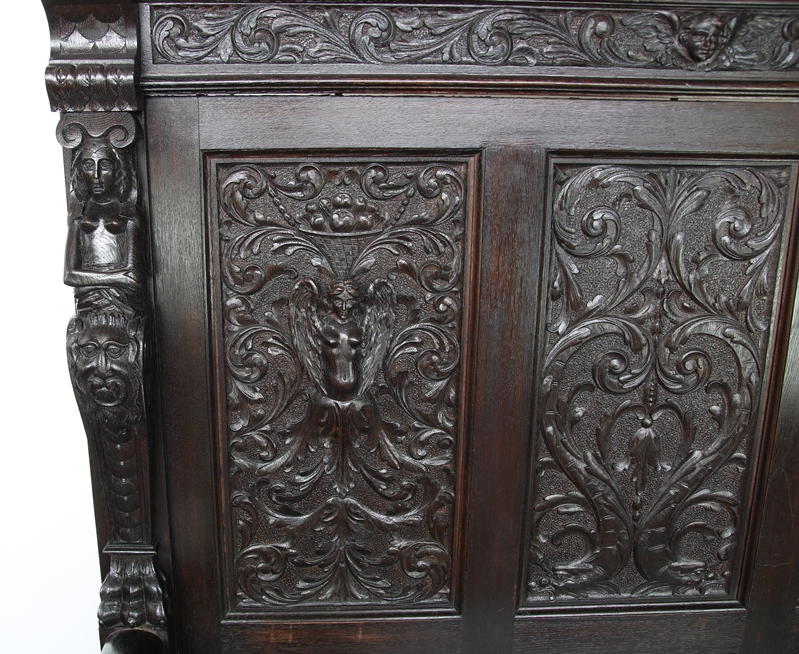 Deutsch 19. Jh. Eiche, dunkel gebeizt. Truhenbank mit in drei Kassetten geteilter Rückwand. Darüber abschließendes Gebälk. Reiche teils figural geschnitzte Verzierungen. Größe ca. 150 x 62 cm, Höhe ca. 170 cm. Sitzhöhe ca. 46 cm. Guter Zustand, minimale berieben.