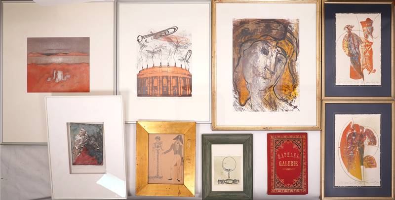 Zeitgenössische Graphiker mit acht Werken in verschiedenen Techniken. Meist signiert und nummeriert bzw. betitelt. Gerahmt, hinter Glas. Größter Rahmen ca. 61 x 51 cm. Dabei eine kleine Mappe mit Stichen nach Raffael. Unterschiedliche Zustände.