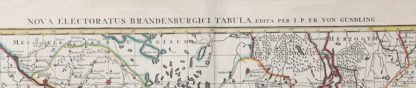 Um 1682 - 1759 Berlin. Nova Electoratus Brandenburgici Tabula Edita. Kupferstich verlegt bei Covens und Mortier um 1680. Unten rechts im Druck bezeichnet, verso bezeichnet. Größe ca. 55 x 65 ca. Mit Bugfalte. Ränder minimal geknickt und eingerissen.