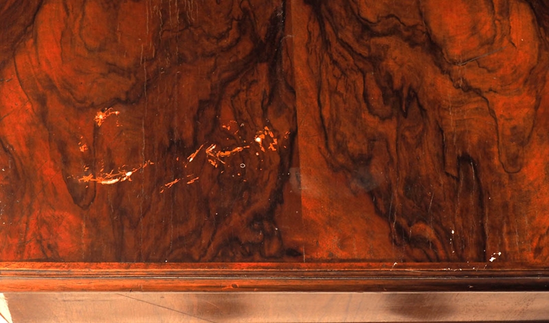 Kommode 19. Jh. Auf breitem Sockelkranz dreischübiger Korpus mit Kopfschub, prismierte Kanten. Überkragende, mehrfach profilierte Deckplatte. Nussbaum und Nussbaumfurnier. Größe ca 85 x 112 x 59 cm. Gebrauchsspuren, einige Fehlstellen.