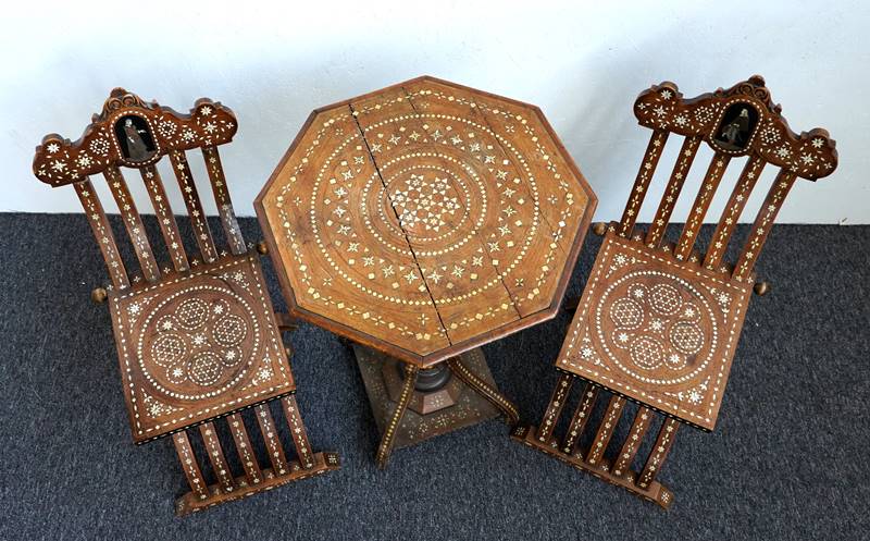 Wohl Spanien 19. Jh. Starker nordafrikanischer Einfluss. Holz mit Beinintarsien. Zwei Scherenstühle, faltbar, und ein achteckiger Tisch mit achteckigem Schaft auf viereckiger Plinthe mit vier geschwungenen Beinen. Floralen Intarsien, auf den Beinen, den Sitzflächen und der Tischplatte. In den Lehnen der Stühle je eine Kartusche mit der Darstellung eines Edelmannes und einer Edelfrau. Größe der Stühle ca. 39 x 41 cm, Höhe ca. 82 cm, Sitzhöhe ca. 46 cm. Durchmesser der Tischplatte ca. 51 cm, Höhe ca. 78 cm. Intarsien teils fehlend, Tischplatte gerissen, Gewand der Frau fehlend. Teils bestoßen.