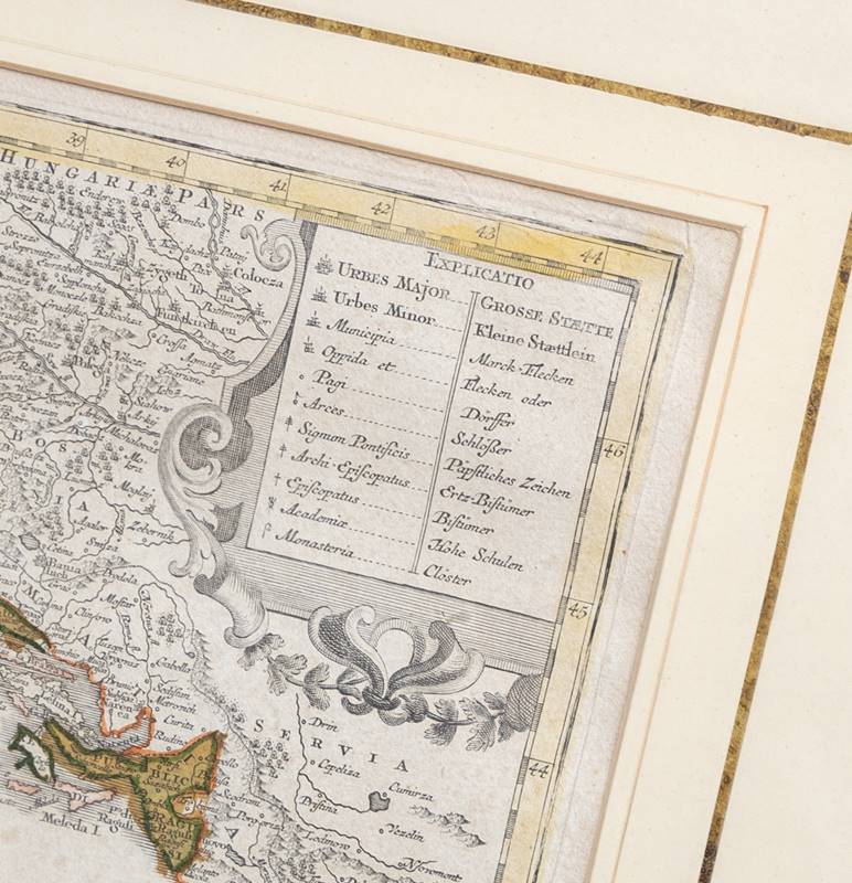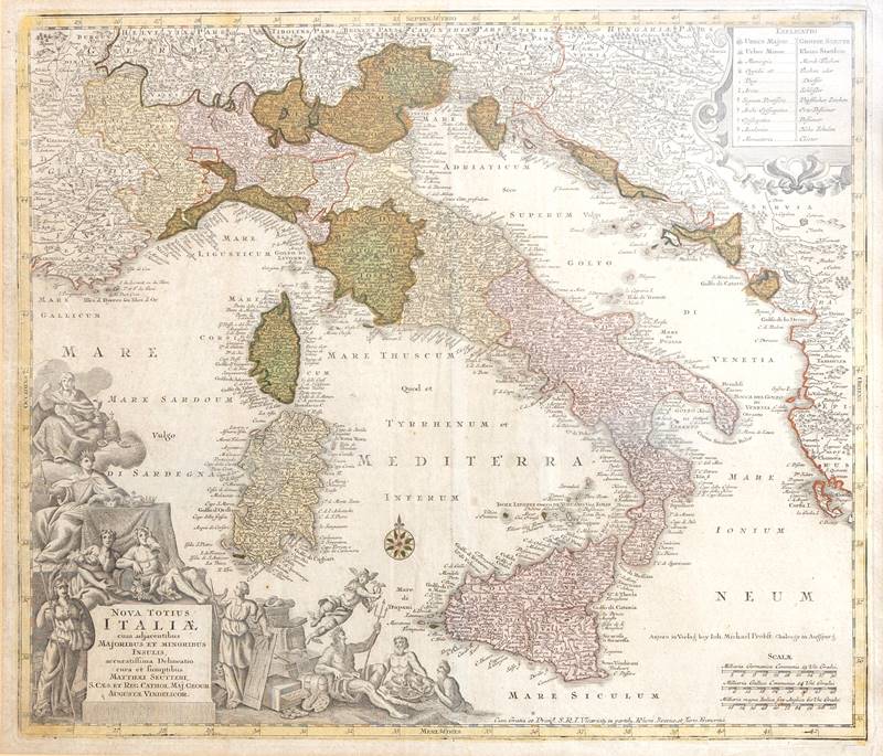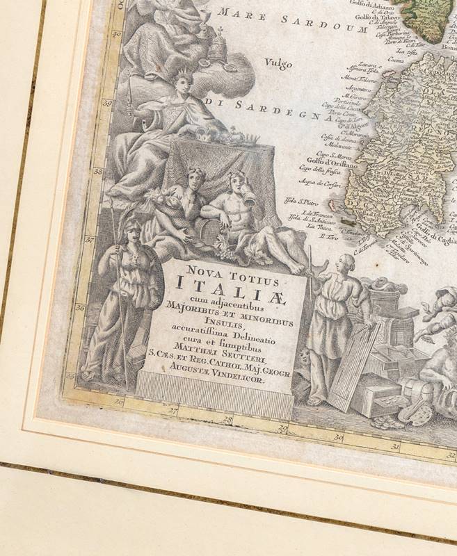 Nova Totius Italiae Kolorierter Kupferstich. Größe ca. 51 x 60 cm, hinter Passepartout und Glas gerahmt ca. 73 x 83 cm.