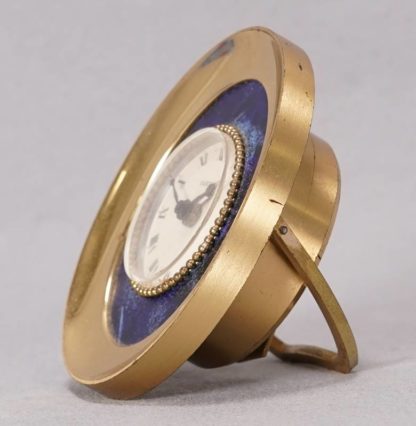 Cartier Reisewecker Schweiz 1970er Jahre. Ovaler Messingrahmen um blaue Fläche in Lapislazulioptik um helles Zifferblatt mit römischen Stundenzahlen. Unter der Zwölf bezeichnet "Cartier", unter der Sechs bezeichnet "Swiss Made". Handaufzugwerk mit Wecker. Größe ca. 8 x 7 cm, Gewicht ca. 230 Gramm. Wecker löst aus. Altersbedingter Zustand wie abgebildet, teils berieben.