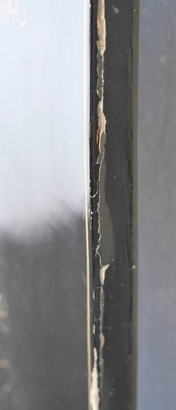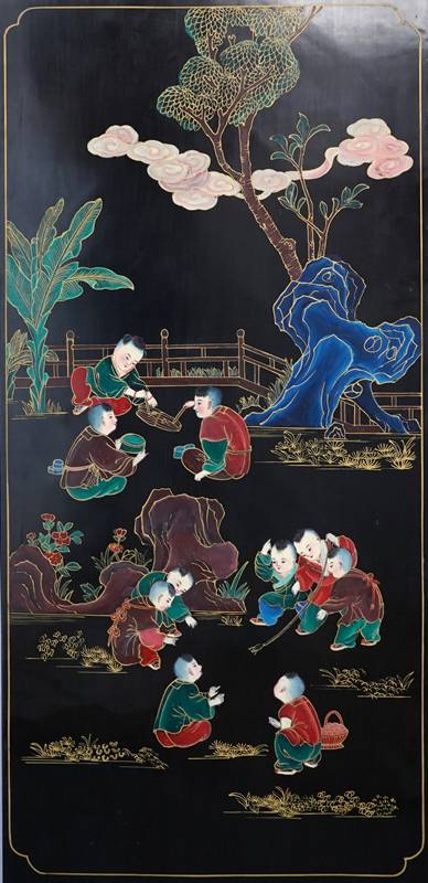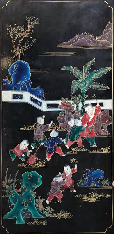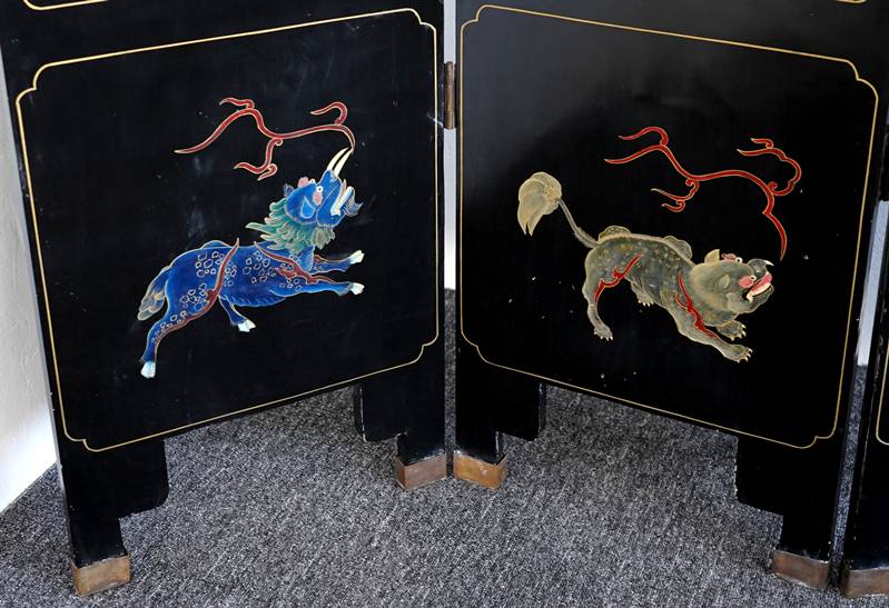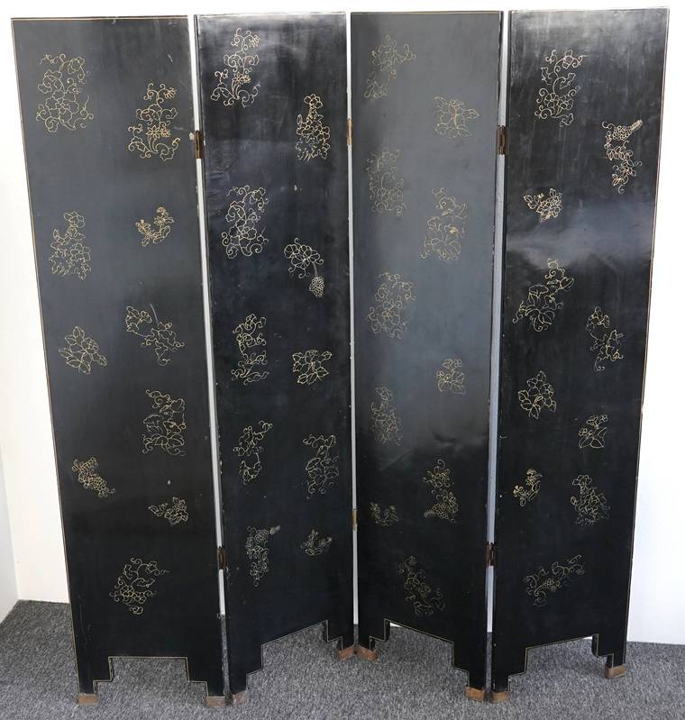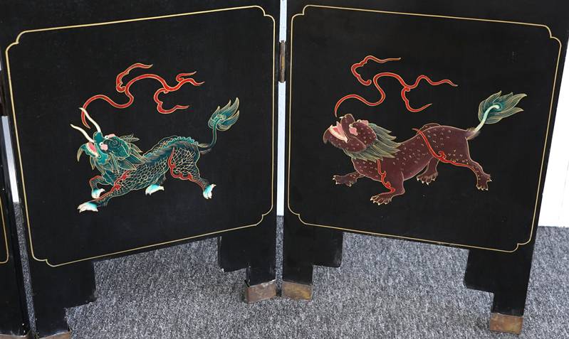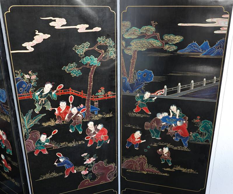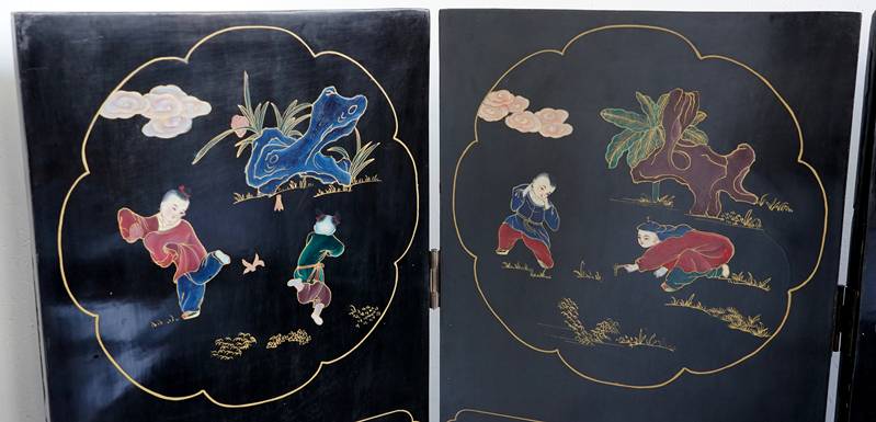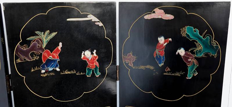 Chinesischer Paravent 20. Jh. Vier Holzpaneele mit schwarzem Lack, Messingfüßen und Messingscharnieren sowie polychromer Malerei und Goldstaffage. Paneele je in drei Felder gegliedert, oben und mittig je spielende Kinder, unten je ein Fabelwesen. Verso je dezente Blumenmalerei in Gold. Größe je Paneel ca. 183 x 43 cm. Teils berieben, teils bestoßen. Kein Versand möglich, bitte selbst besichtigen.