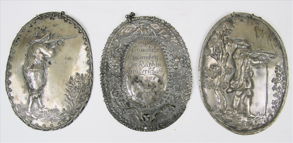 Deutsch 1705. Zentralstück mit Devise der Banken-Brüderschaft und Datierung und zwei weitere reliefierte Darstellungen von schießenden Jägern. Größe je ca. 10 x 8 cm. Altersbedingter Zustand.