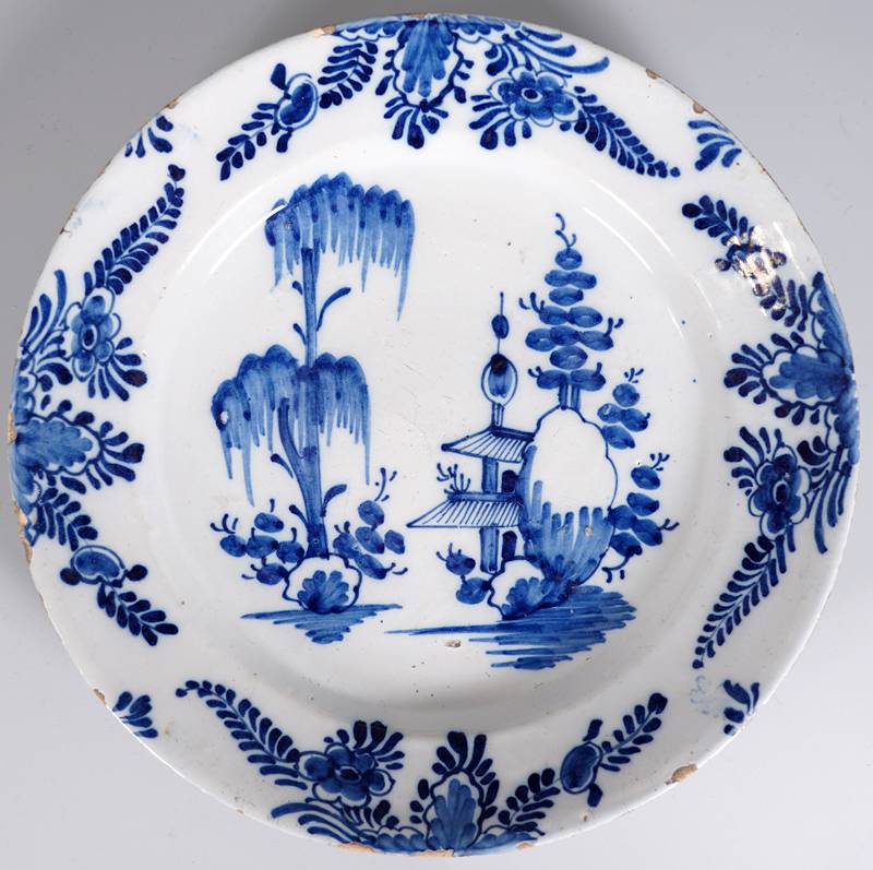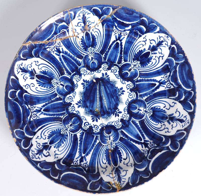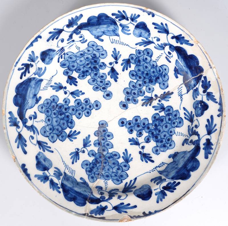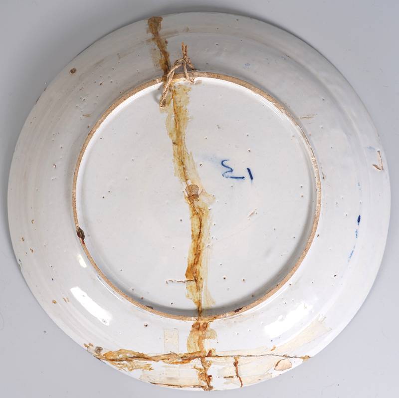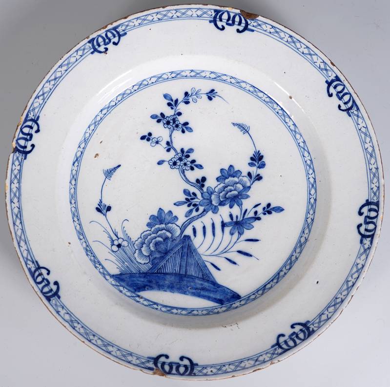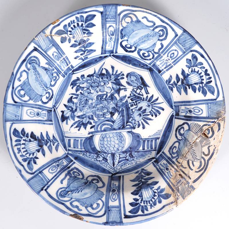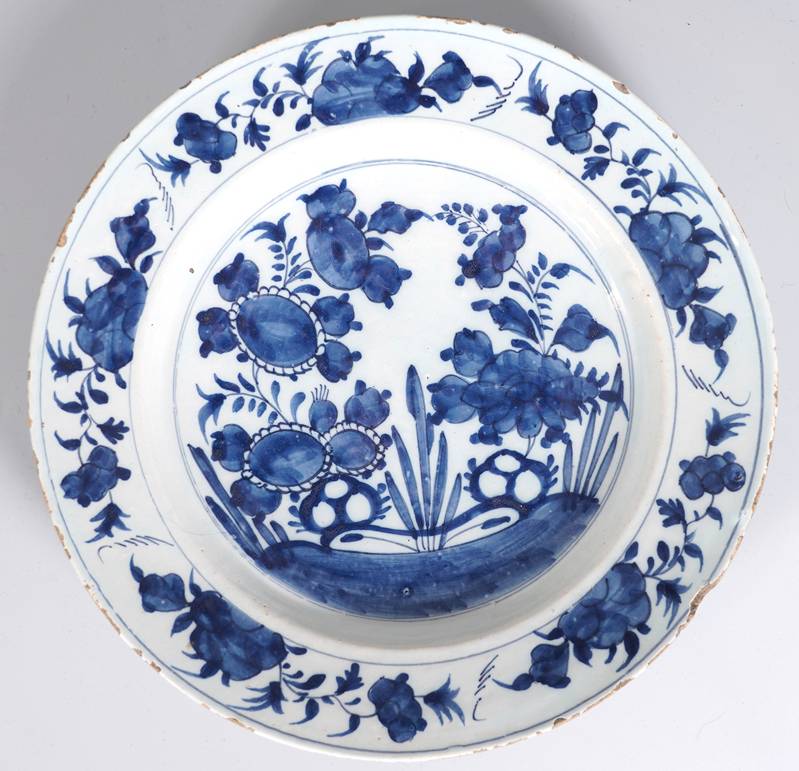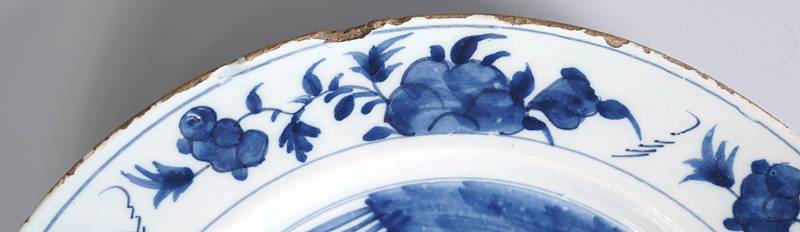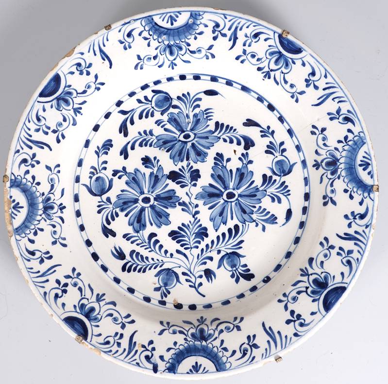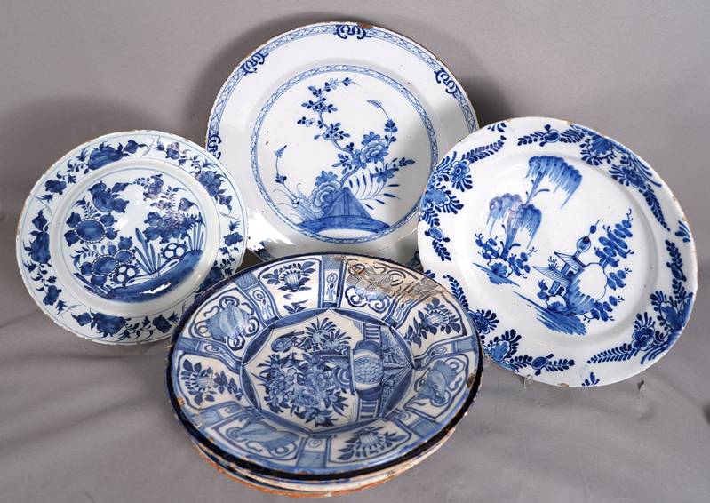 Qing-Dynastie um 1800. Acht Teller in diversen Größen und mit diversen Dekoren, Blaumalerei. Meist floraler und vegetabiler Dekor, teils mit architektonischen Elementen. Max. Durchmesser ca. 39 cm. Teils beschädigt, altrestauriert, geklebt. Teils mit alter Wandaufhängung. Gesamtgewicht ca. 9,6 kg.