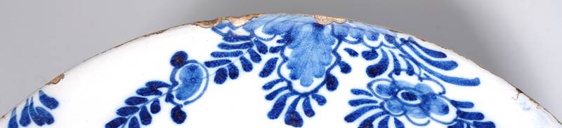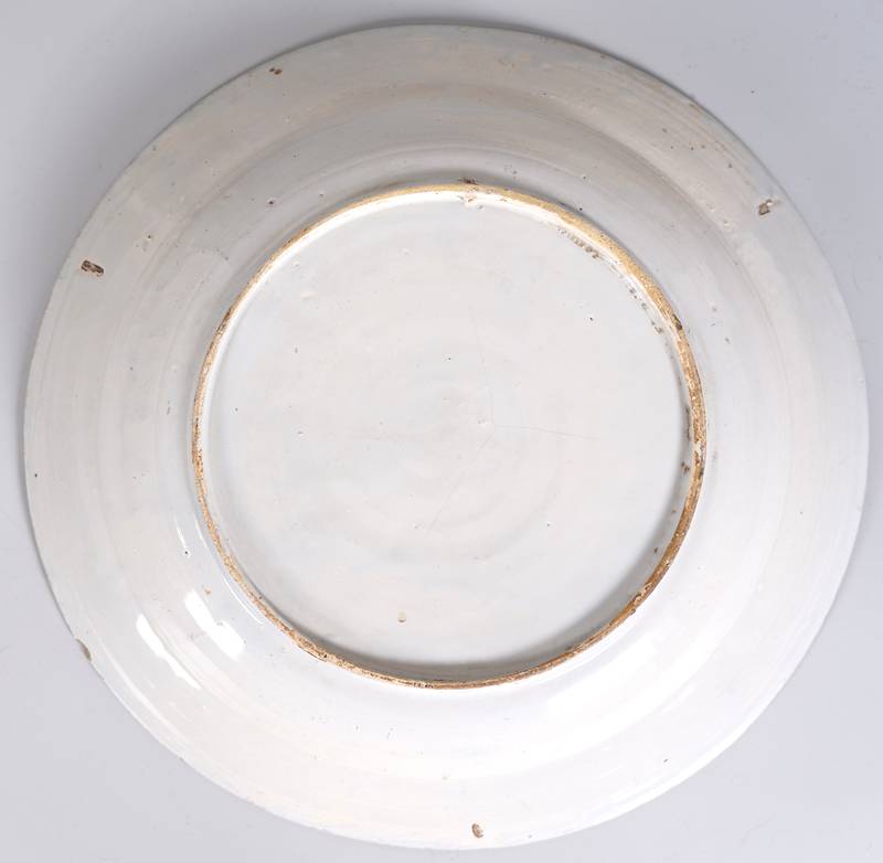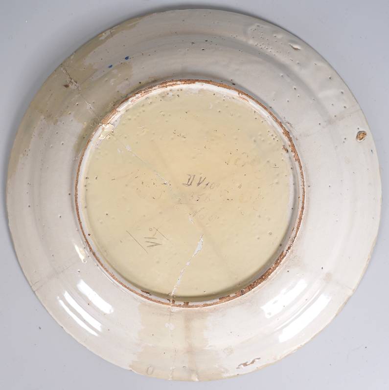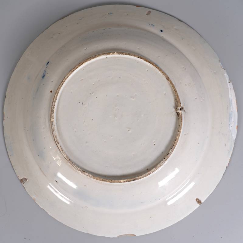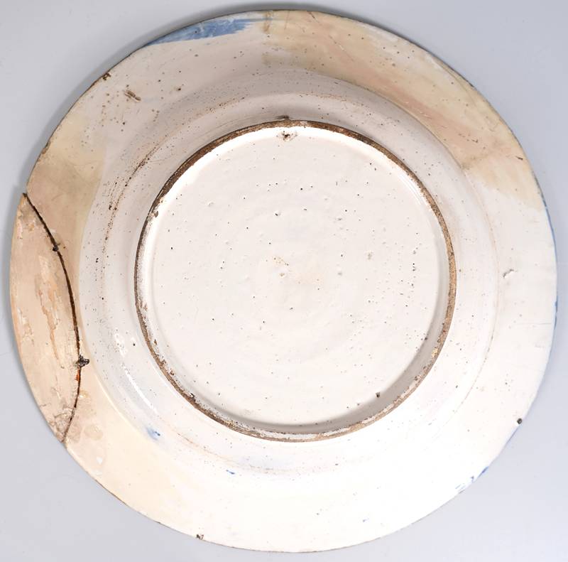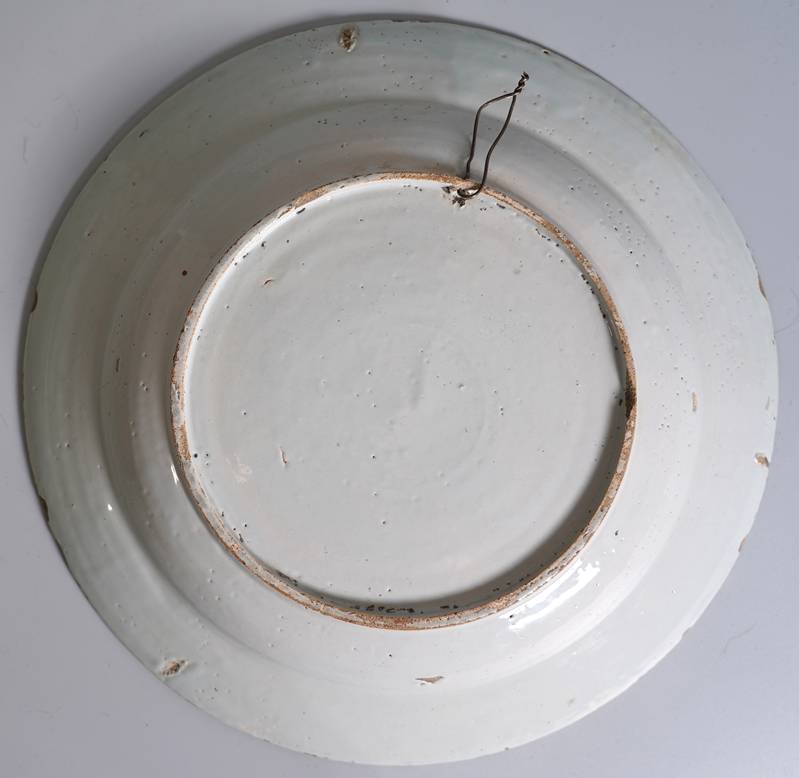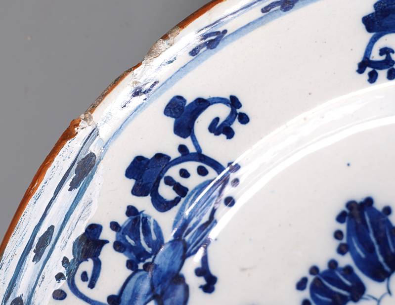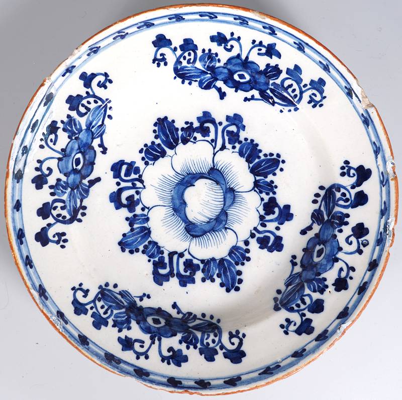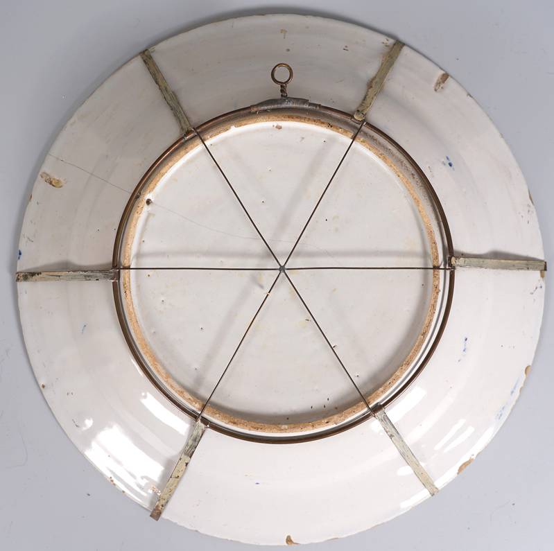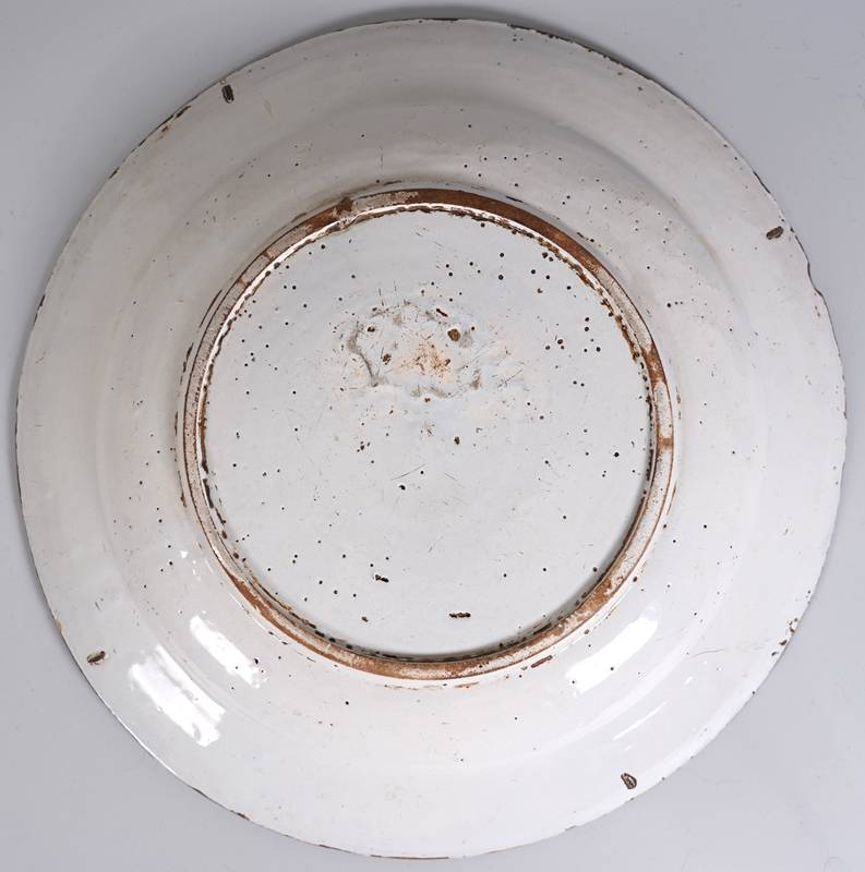Qing-Dynastie um 1800. Acht Teller in diversen Größen und mit diversen Dekoren, Blaumalerei. Meist floraler und vegetabiler Dekor, teils mit architektonischen Elementen. Max. Durchmesser ca. 39 cm. Teils beschädigt, altrestauriert, geklebt. Teils mit alter Wandaufhängung. Gesamtgewicht ca. 9,6 kg.
