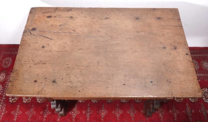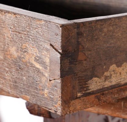 Wohl Spanien 17. Jh. Hartholz, patiniert. Mehrfach profilierte Seitenteile und eingesetzte Zarge, frontseitig mit zwei Schubladen. Aufgesetzte, schwere Massivholzplatte. Teils mit alten Eisenklammern. Größe ca. 130 x 79 cm, Höhe ca. 83 cm.
