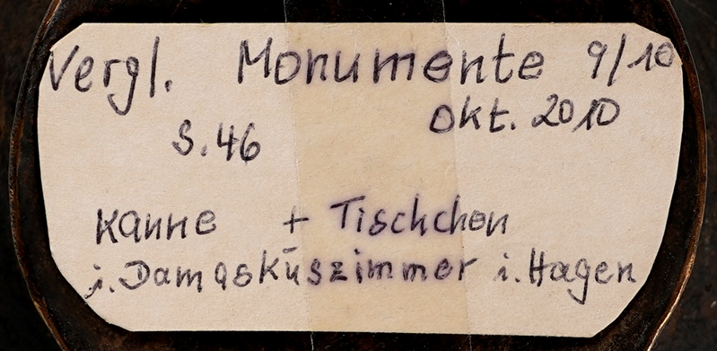 Kanne Damaskus 19. Jh. Metall. Bauchiger Korpus mit langem Ausguss und aufklappbarem Deckel. Unter dem Boden bezeichnet. Größe ca. 23 x 15 cm, Höhe ca. 31 cm, Gewicht ca. 980 Gramm. Ähnliche Kanne im Damaskus-Zimmer in Dresden. Jug. Damascus 19th century metal. Bellied body with long spout and hinged lid. Inscribed under the bottom. Size approx. 23 x 15 cm, height approx. 31 cm, weight approx. 980 grammes. Similar jug in the Damascus Room in Dresden.