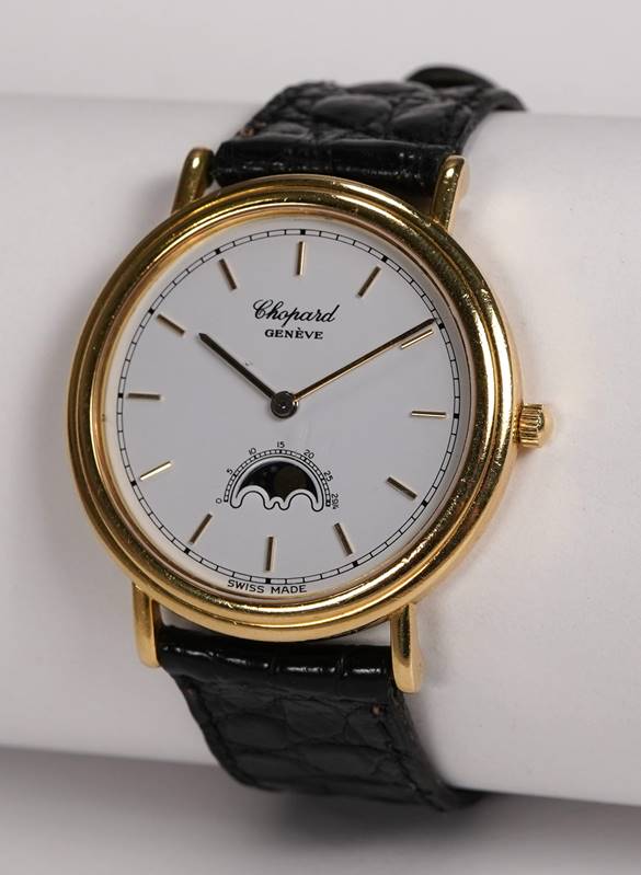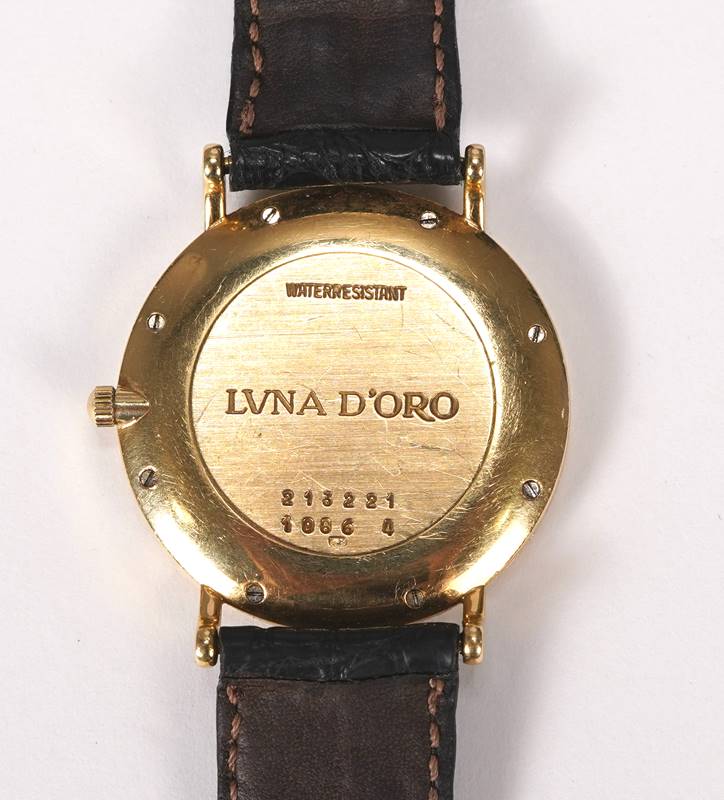 Genf. Gelbgold 750. Weißes Ziffernblatt mit Mondphase über der Sechs und Bezeichnung unter der 12. Quarzwerk. Verso bezeichnet und nummeriert 213221 1086 4 sowie Kontrollstempel mit Bernhardinerkopf und Stadtbuchstabe. Original-Lederarmband mit Bezeichnung und vergoldeter Schließe. Durchmesser des Ziffernblatts ca. 2,8 cm, Länge des Armbands ca. 21 cm. Gesamtgewicht ca. 33 Gramm. Nicht geöffnet, Funktion nicht geprüft.