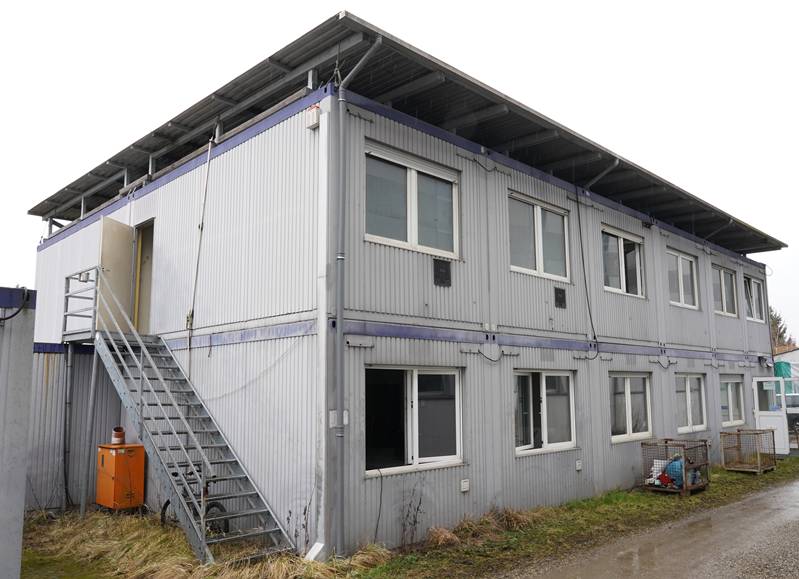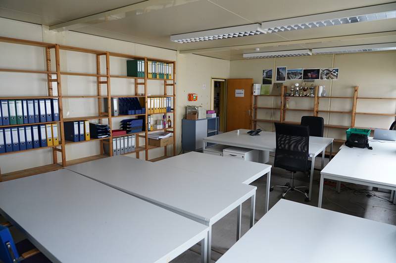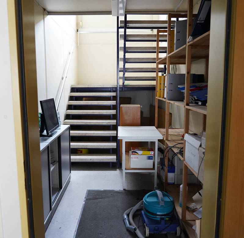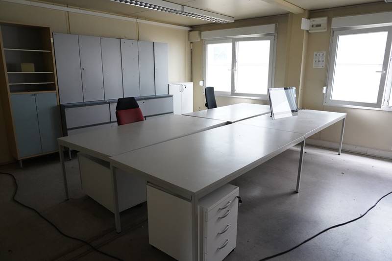 Containeranlage bestehend aus 24 (wohl) Kleusberg Einzelcontainern miteinander auf zwei Stockwerken verbunden. Inklusive Aufgang innen und außen. Elektrifiziert und Wasseranschlüsse. Mit Inhalt wie abgebildet, ohne die Ordner und die Bilder an den Wänden und ohne die Synology NAS und die Anlage darunter. Größe pro Element ca. 6 x 2,5 m, Höhe außen ca. 2,85 m. In einem der unteren Containern ist der Boden durchgerochen.