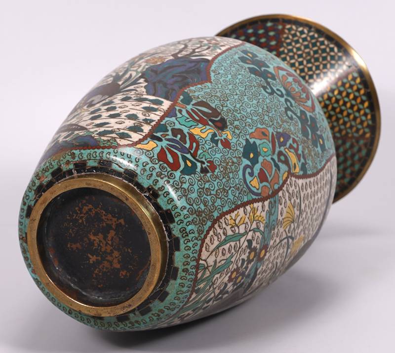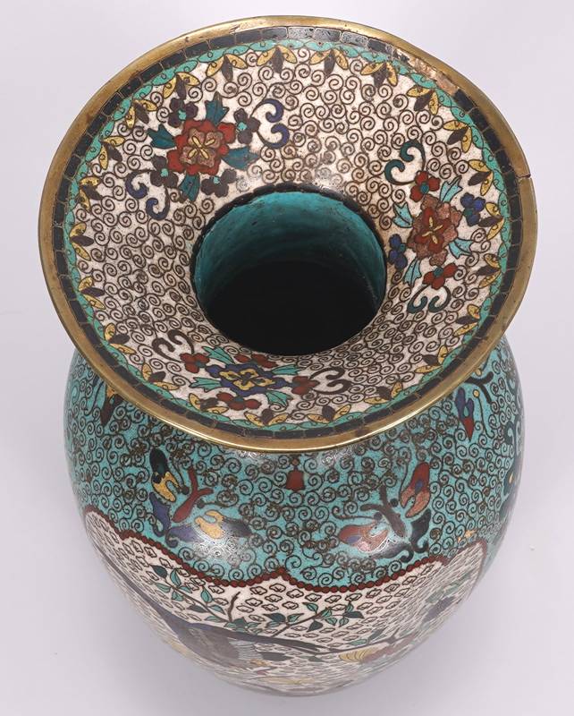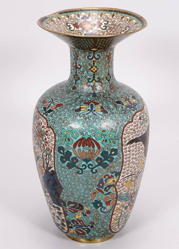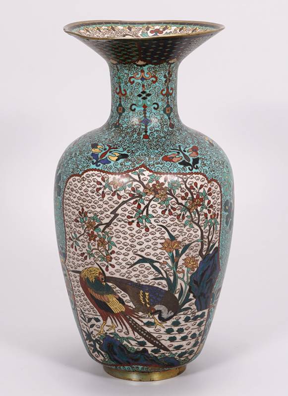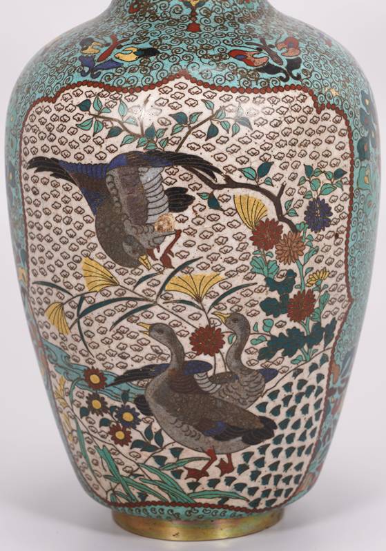 Cloisonné Vase China 19. Jh. Metall und polychromes Emaille. Hellblauer Grund mit ornamentalen Mustern. Zwei Bildkartuschen, einmal mit zwei Fasanen, einmal mit drei Enten. Durchmesser ca. 15 cm, Höhe ca. 31 cm. Teils bestoßen, teils verformt, teils fehlt Emaille.