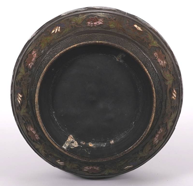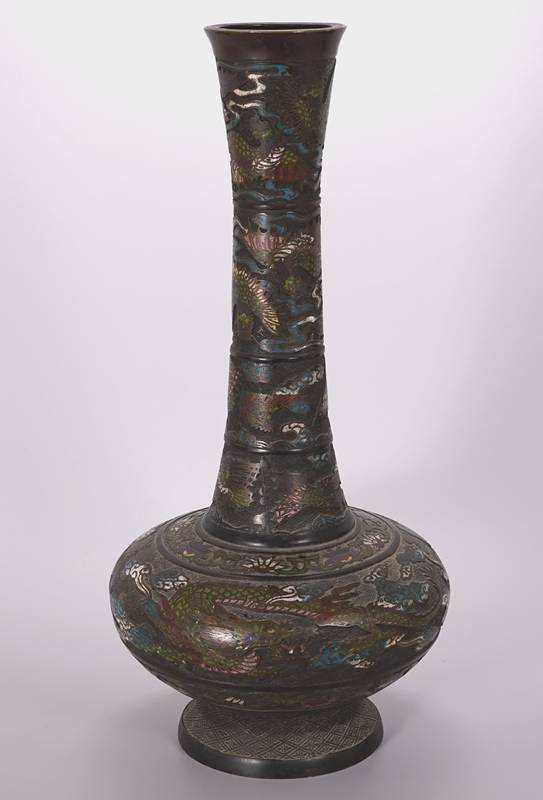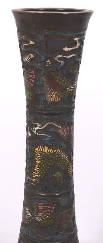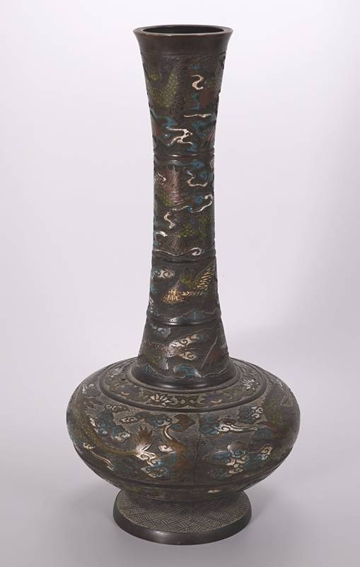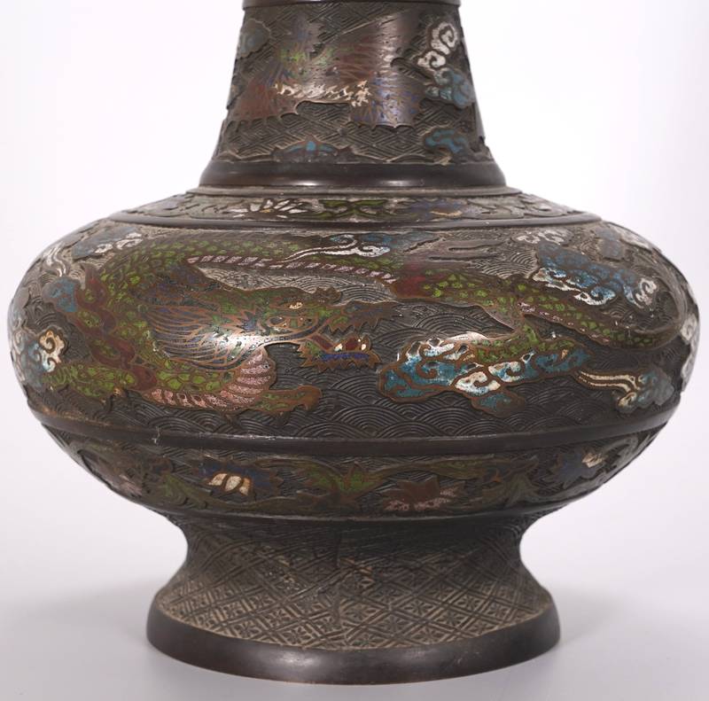 Cloisonné Vase China, wohl um 1900. Bronze mit farbigem Zellenschmelzdekor. Große Vase mit bauchigem Korpus und langem, schmalem Hals. Mit reichem Drachendekor. Größe ca. 25 x 25 cm, Höhe ca. 53,5 cm, Gewicht ca. 3,7 kg. Zustand wie abgebildet.