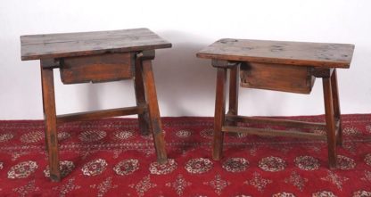 Zwei Beistelltischchen Wohl Spanien 18. Jh. Verschiedene Hölzer. Je vier ausgestellte Beine im Verbund, leicht überkragende Platte und zentrale Schublade. Größe 59 x 44 cm, Höhe ca. 53 cm, einmal Größe 60 x 39 x 48 cm.