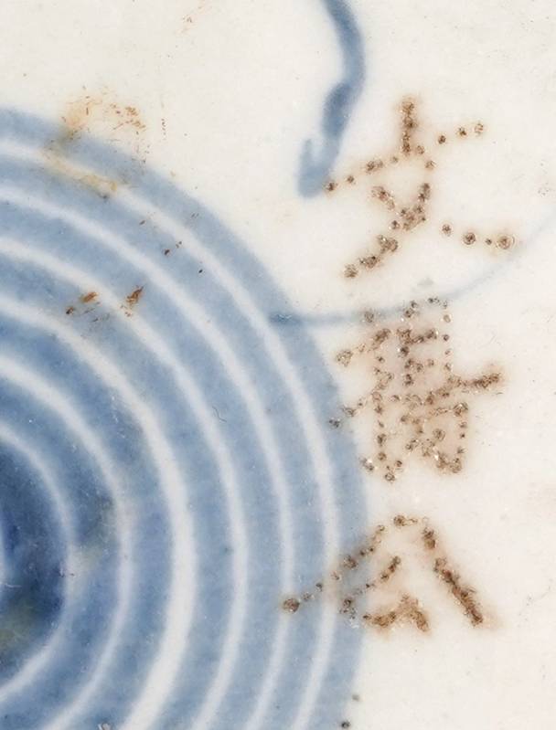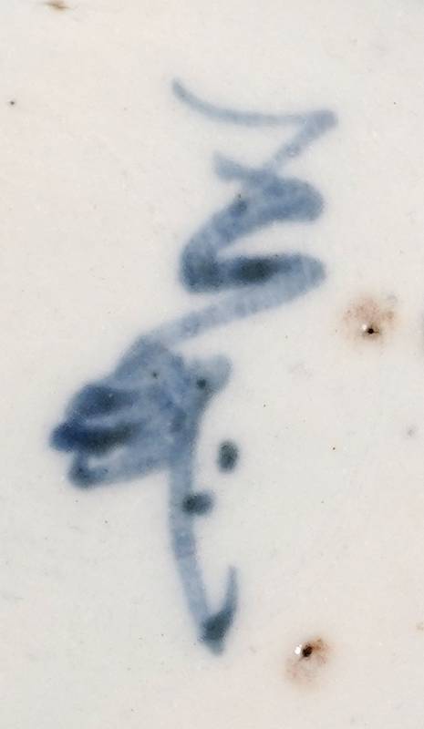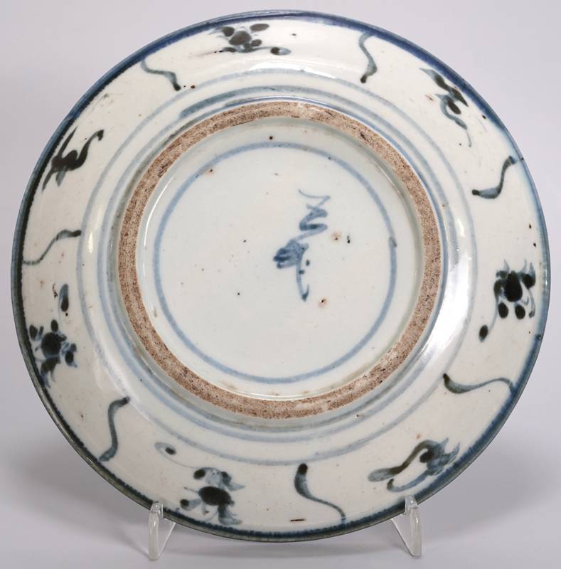China Ming-Dynastie. Steingut mit weiß-blauer Glasur. Unter dem Boden mit ungedeuteter, blauer Marke, im Spiegel geprägte Schriftzeichen. Durchmesser ca. 16,5 cm, Höhe ca. 3 cm.