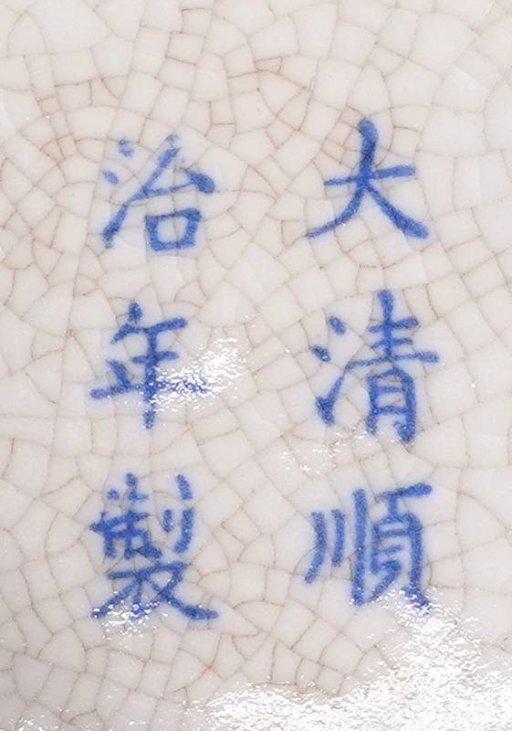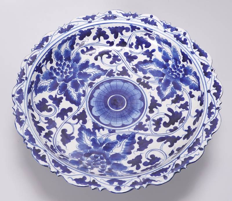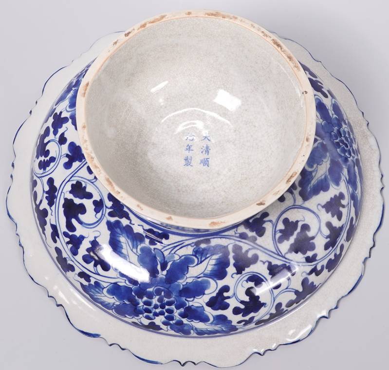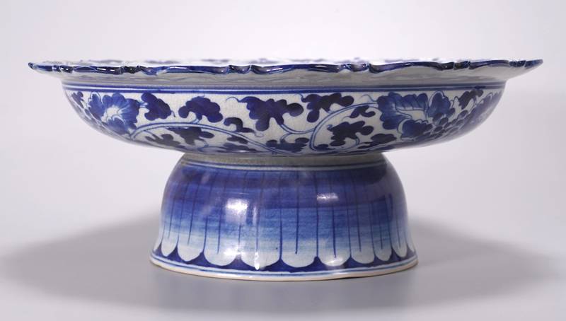 Fußschale China wohl spätere Replik. Steingut mit blau-weißer Bemalung. Unter dem Boden Shunzhi Marke. Durchmesser ca. 32 cm, Höhe ca. 13 cm.