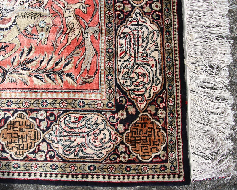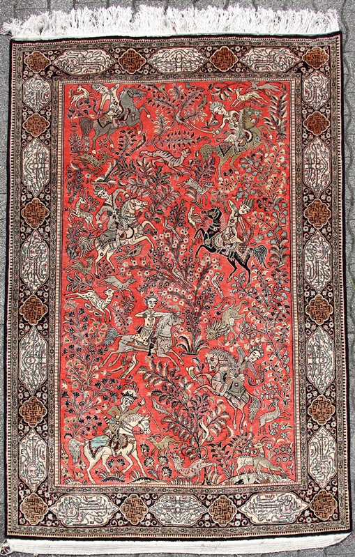 Jagdteppich Persien 20. Jh. Großer Seidenteppich mit fein geknüpften Jagdmotiven und floralen Elementen. Größe ca. 223 x 142 cm, ca. 64 Knoten/qcm.