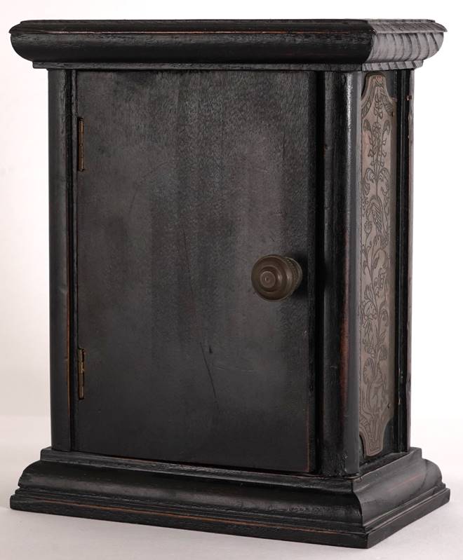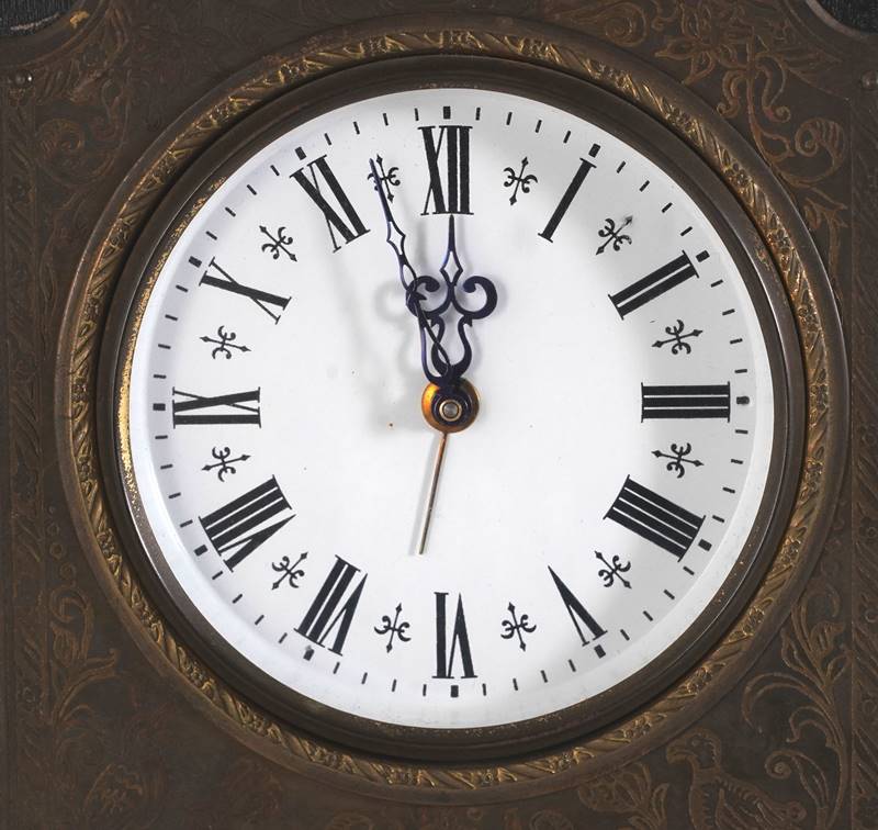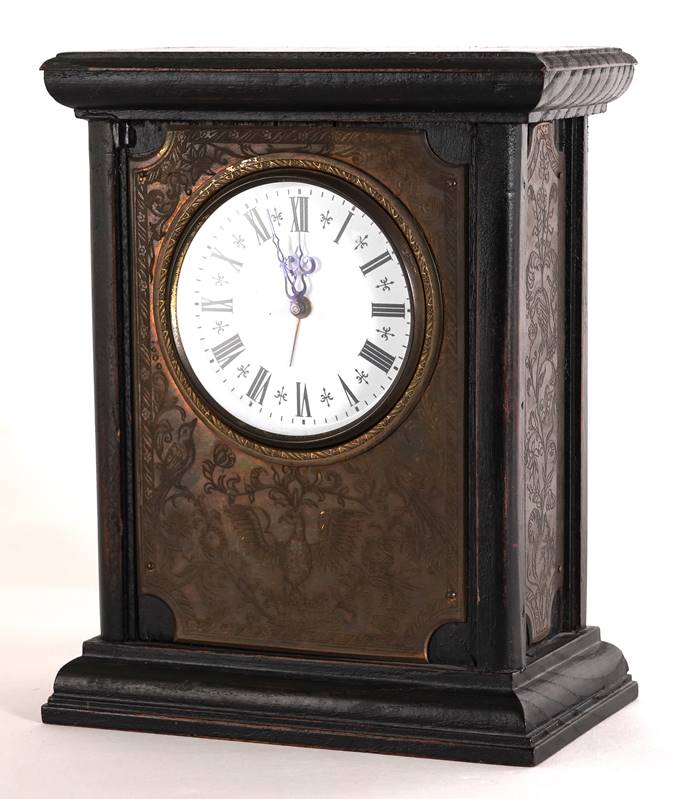 Wecker 20. Jh. Hochrechteckiger Holzkorpus mit Metallbeschlägen. Rundes Ziffernblatt mit römischen Ziffern. Handaufzugswerk. Größe ca. 17 x 9 cm, Höhe ca. 21 cm.