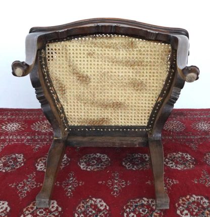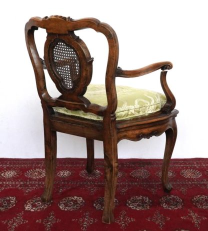 Frankreich 18. Jh. Nussbaum. Bewegte Form mit Blattwerkschnitzereien und geschweiften Beinen. Sitzfläche und Medaillon der durchbrochen gearbeiteten Rückenlehne mit Korbgeflecht (teils erneuert). Größe ca. 60 x 58 cm, Höhe 68 cm, Sitzhöhe ca. 42 cm. Altrestauriert.