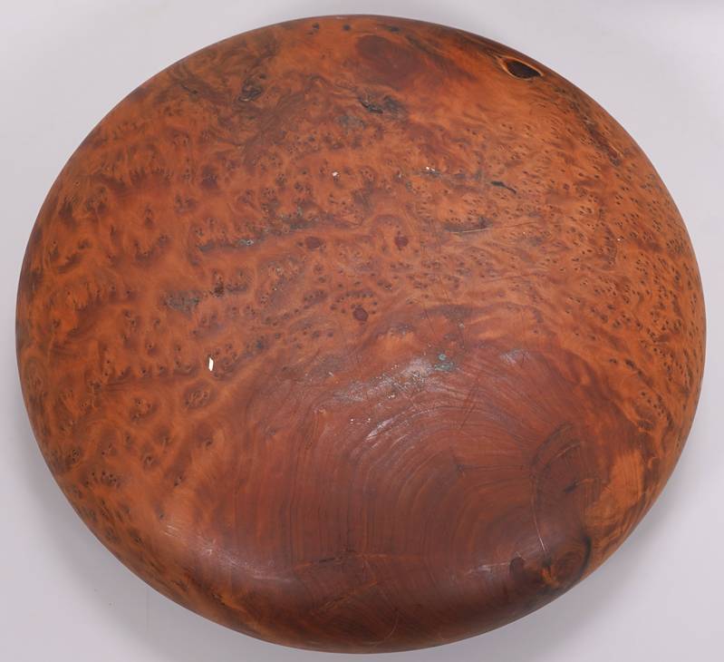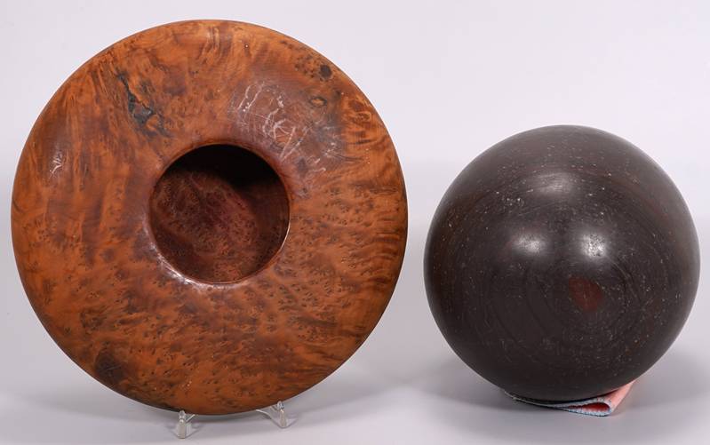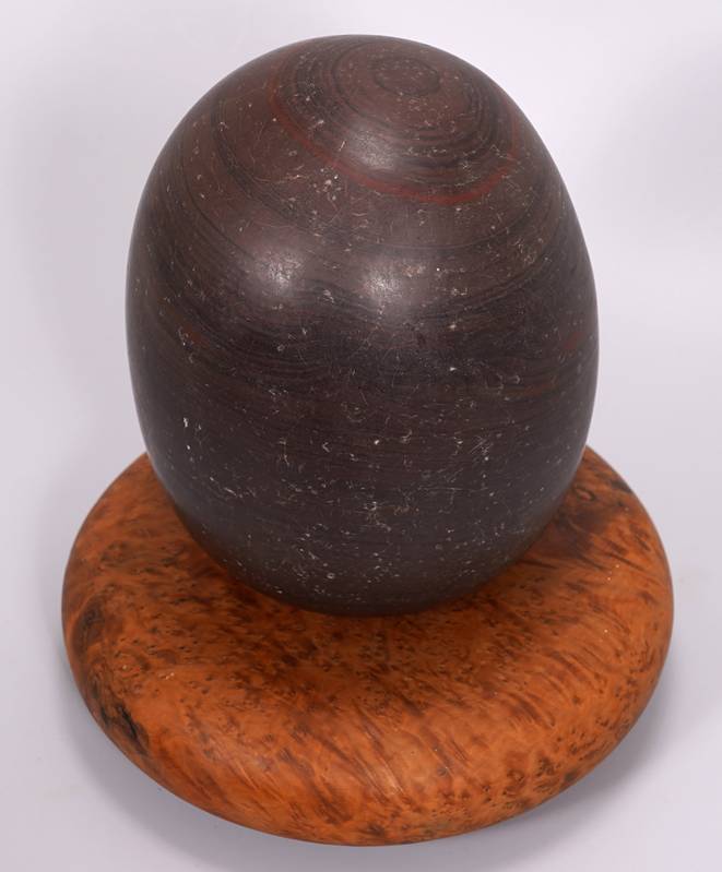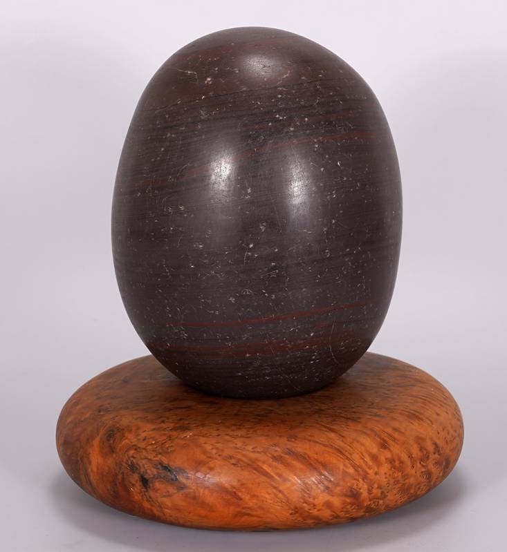 Großes Shiva-Lingam Indien 20. Jh. Grauer Flussstein in Eiform mit roten Einschlüssen auf Wurzelholzschale. Durchmesser des Steins ca. 19 cm, Höhe ca. 24 cm. Gewicht ca. 11,4 kg. Durchmesser der Schale ca. 25 cm, Höhe ca. 7 cm. Teils bestoßen. Shiva-Lingam oder auch "Brahmanan-Ei" oder "Welten-Ei" ist das Symbol des hinduistischen Gottes Shiva. Traditionell handelt es sich um einen natürlich geformten Stein aus dem Fluss Narmada. Er steht im indischen Hinduismus für das Werden und Vergehen im ewigen Kreislauf der Natur und steht im Zentrum jedes Shiva Tempels. Die Form der Steine symbolisieren die männliche Ruhe, die Einschlüsse im Stein stehen für die weibliche Unruhe.
