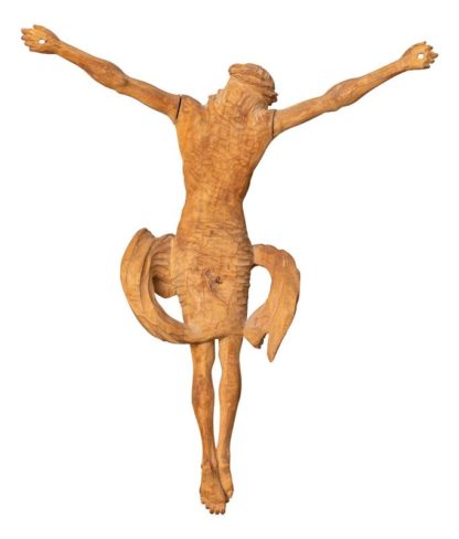Riemenschneider, Tilmann nach Ende 19. Jh. Corpus Christi im Dreinageltypus. Lindenholz, geschnitzt. Größe ca. 42 x 5 cm, Höhe ca. 45 cm. Alterspatina. Vier Finger der rechten Hand und Fassung fehlen. Der sterbende Christus im sogenannten Dreinageltypus greift deutlich eine Vorlage Tilmann Riemenschneiders (1460 - 1531) auf, wie sie sich im Bode Museum, Berlin, unter Inventarnr. 2931 befindet. Das ursprünglich 1515/20 entstandene Werk mit dramatischer Tuchdraperie liegt hier in einer kleinformatigen Nachschöpfung vor, die das Können des Schnitzkünstlers ebenfalls unter Beweis stellt.