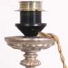 20. Jh. Fuß in barockem Stil. Holz, silberfarben gefasst. Auf drei volutenförmigen Füßen, sich nach ober verjüngend und mit Engelsköpfen, Voluten und Akanthusblättern verziert. Wohl ehemals ein Kerzenleuchter, nachträglich elektrifiziert. Mit eingezogenem, zylinderförmigem Lampenschirm. Durchmesser Fuß ca. 24 x 24 cm, Höhe ca. 78 cm. Durchmesser Lampenschirm ca. 40 cm, Gesamthöhe 101 cm. Funktion nicht geprüft.