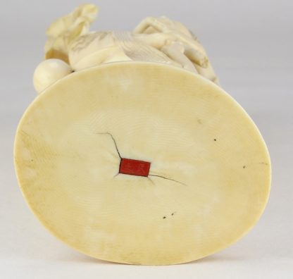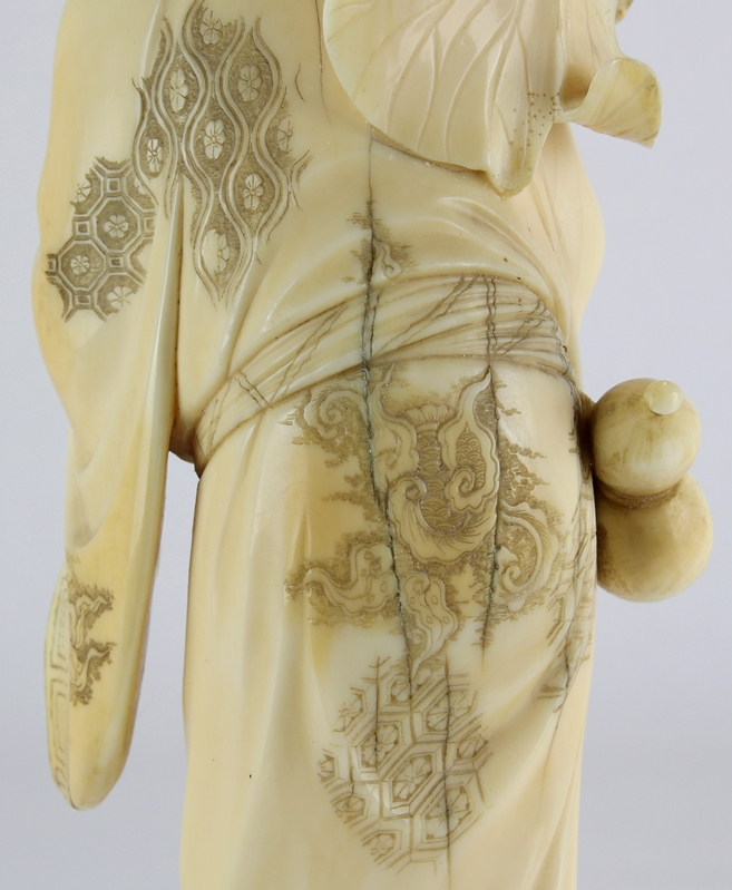 China nach 1900. Wanderer mit Stock und Beutel über der Schulter. Elfenbein, rundum geschnitzt und dekoriert. Unter dem Boden eingelegte Plakette mit Signatur. Größe ca. 7 x 5,5 cm, Höhe ca. 19,5 cm, Gewicht ca. 360 Gramm.