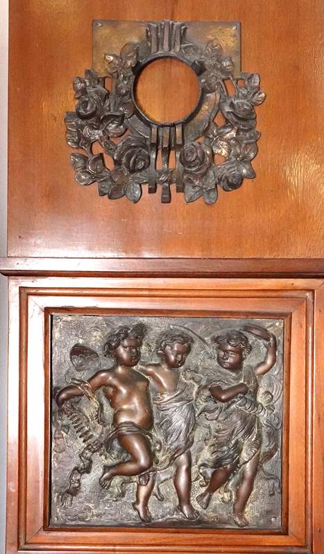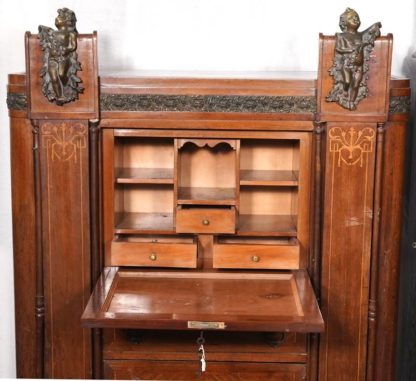 Mahagoni, teils furniert und mit Obstholzintarsierungen. Zahlreiche Bronzereliefs und Putten. Marmorplatten. Bestehend aus einem Bett, Größe des Rückenteils ca. 210 cm hoch und ca. 250 cm breit, Länge des Bettkastens ca. 200 cm. Seitlich zwei Nachttische. Dreitüriger Schrank mit Spiegel in der Mitte, Größe ca. 210 x 65 cm, Höhe ca. 260 cm. Waschtisch mit drei Schubladen und zwei seitlichen Türen, ca. 160 x 70 cm, Höhe bis zur Marmorplatte ca. 110 cm, gesamt ca. 230 cm. Sekretär mit drei Schubladen und Klappe, Größe ca. 115 x 55 cm, Höhe ca. 172 cm. Die Bronzearbeiten wurden von den Brüdern Carlo und Luigi Rigola aus der Stadt Cantu in der Nähe von Mailand in den 1930-er Jahren gefertigt. Zustand wie abgebildet, insgesamt restaurierungsbedürftig.