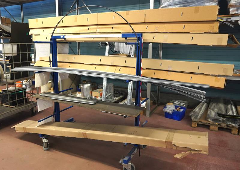 Materialtransportwagen mit diversen Materialien, teils Schüco.