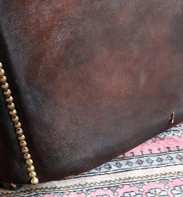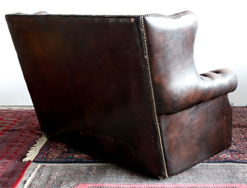 Zweisitzer Chesterfield Optik 20. Jh. Braunes Leder mit aufwendiger Polsterung. Größe ca. 152 x 100 cm, Höhe ca. 95 cm, Sitzhöhe ca. 45 cm. Altersbedingter Zustand mit stärkeren Gebrauchsspuren wie abgebildet.
