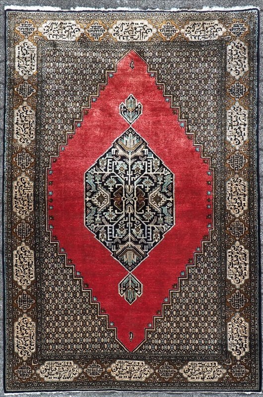Nordpersien 20. Jh. Kaschmirseide. Brücke mit Mehrfachbordüre und rechteckiges Innenfeld mit zwei verschiedenfarbigen Sechsecken mit stilisiert floralen Elementen. Größe ca. 206 x 137 cm, ca. 42 Knoten/qcm.