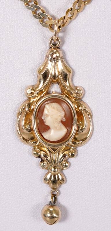Gemmenanhänger an Kette 585 und Schaumgold. Feine Panzerkette, punziert auf Schließe, mit Gemmenanhänger in Fassung in Rocaillenform(Schaumgold, nicht zugehörig). Länge der Kette ca. 50 cm, Gewicht der Kette ca. 8,4 Gramm.