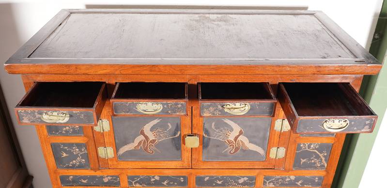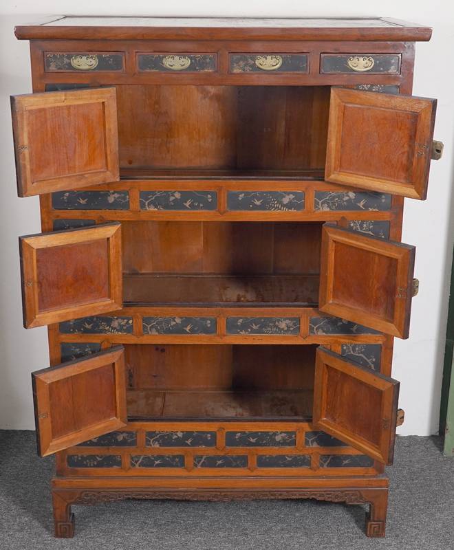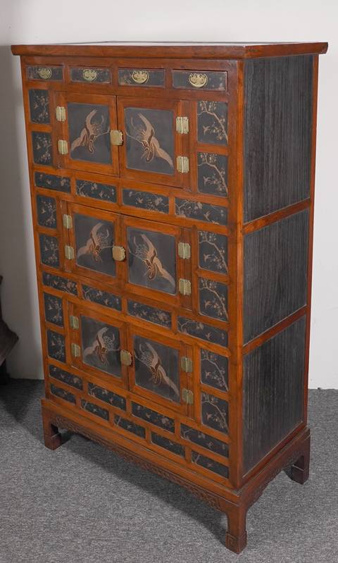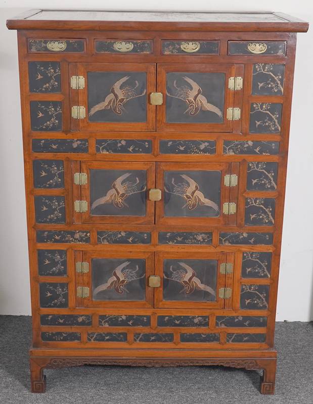 Wohl Japan Meiji Periode. In drei Zonen gegliederte Front mit je einer Doppeltür umgeben von Kassetten. Unter der überkragenden Platte vier Schubladen. In den Kassetten und den Türen leicht reliefierte Vogel- und Pflanzendarstellungen auf mattem Untergrund (wohl hiramaki-e oder takamaki-e Technik). Größe ca. 105 x 52 cm, Höhe ca. 153 cm. Zustand wie abgebildet, Schlösser/Schlüssel anbei.