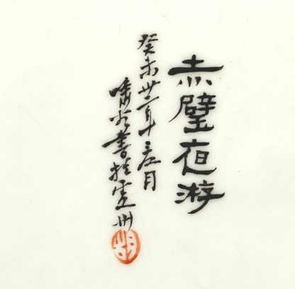 Porzellanbild China. Ein kleines Fischerboot vor einer hohen Klippe. Auf Porzellan gemalt. Mit Schriftzeichen und Signaturstempel. Größe ca. 38 x 24 cm, Rahmen ca. 52 x 39 cm. Guter Zustand. (Nr. 382) Porcelain painting. China 20th c. A small fishing boat in front of a high cliff. Painted on porcelain. With writing and signature stamp. Size approx. 38 x 24 cm, frame approx. 52 x 39 cm. Good condition.