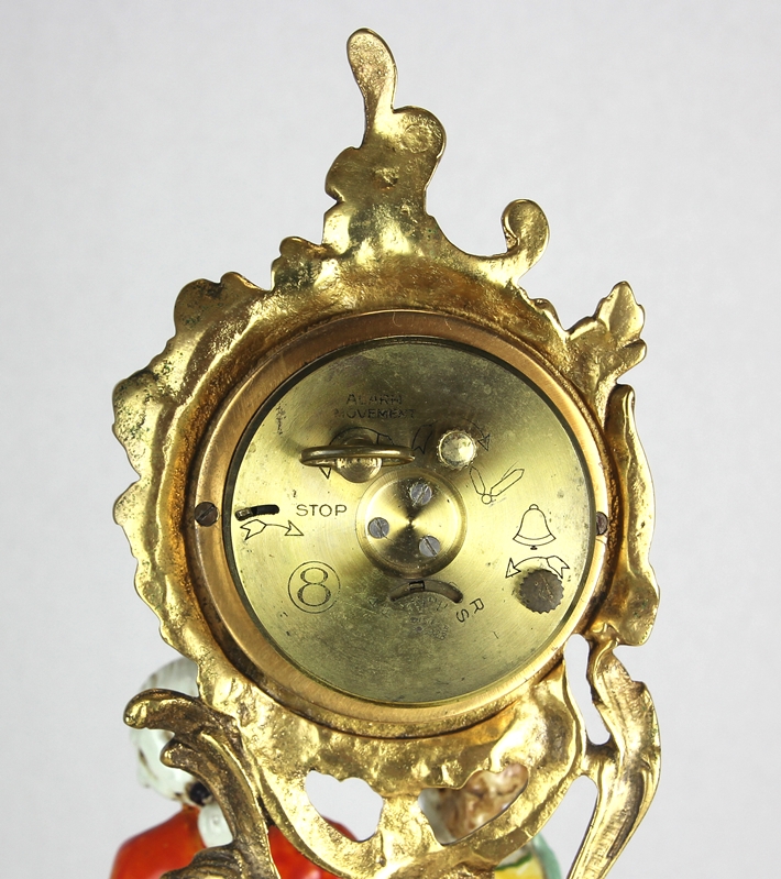Thüringen um 1900. Goldstaffiertes Metall mit Porzellan. Sockel und Ziffernblatteinfassung in Rocaillenform. Figurengruppe in Form eines Arm in Arm gehenden Paares. Weißes Ziffernblatt mit römischen Zahlen und lateinischer Minuterie. Uhrenwerk mit Wecker. Größe ca. 15 x 12 cm, Höhe ca. 18 cm. Nicht geprüft. Figurengruppe teils best.