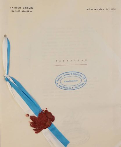 Ikone Russland um 1800. Heiliger Nikolaus mit Segensgestus und Buch. In der Aureole die Darstellung von Gottvater, dem Heiligen Petrus und dem Heiligen Paulus. Öl auf Holz. Größe ca. 50 x 42 cm, Rahmen ca. 63 x 55 cm. Altrestaurierter, vertikaler Riss auf der rechten Seite. Anbei eine Quittung über 2100 DM von 1976 sowie eine Expertise des Kunsthistorikers Rainer Grimm München aus dem selben Jahr.