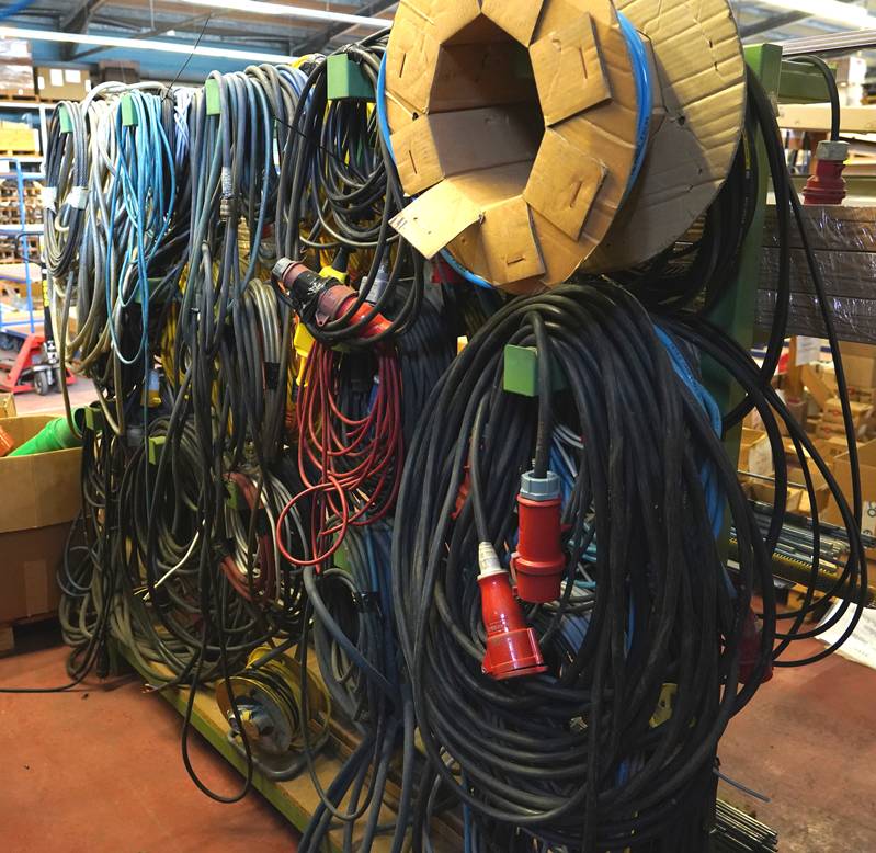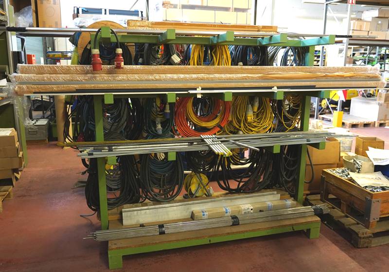 Lagergestell mit diversen Stromkabeln und Profilen.
