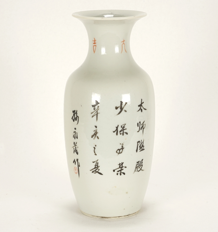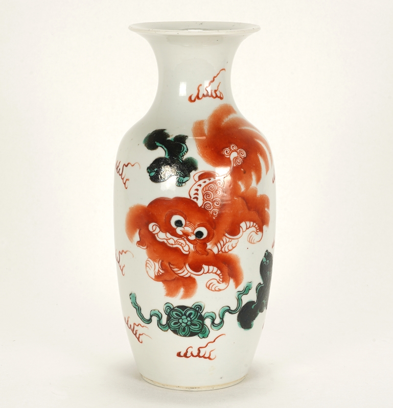 Vase China 19. Jh. Porzellan, polychrom staffiert. Ein roter Pho-Hund oder Tempeldrache umgeben von kleinen grünen Tieren. Schriftzeichen und Siegel. Unter dem Boden Vierfeldermarke. Durchmesser ca. 11 cm, Höhe ca. 24 cm. (Nr. 353) China 19th c. Porcelain, polychrome painted. A red Pho dog or temple dragon surrounded by small green animals. Signs and seals. Four-field mark under the bottom. Diameter ca. 11 cm, height ca. 24 cm.