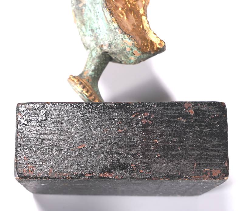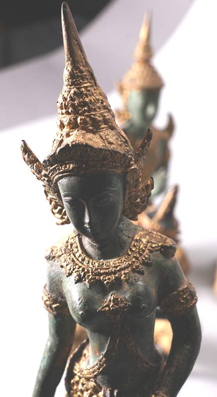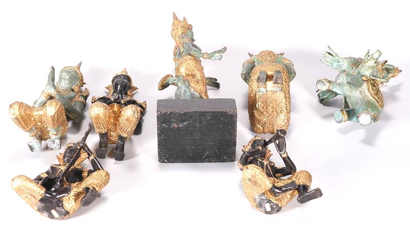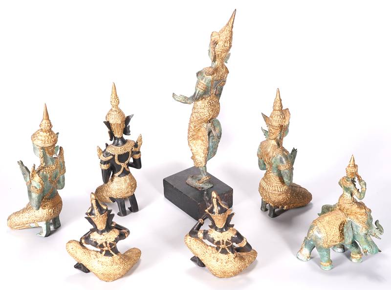 Thailand. Insgesamt sieben Figuren aus Metallguss, grün oder schwarz patiniert und goldstaffiert. Drei knieende Tempelwächter, eine tanzende Wächterin auf einem Holzsockel, zwei musizierende Wächter und einmal die Göttin Indra auf einem dreiköpfigen Elefanten. Höhe der Tänzerin ca. 33,3 cm. Gesamtgewicht ca. 7 kg. Zustand wie abgebildet.