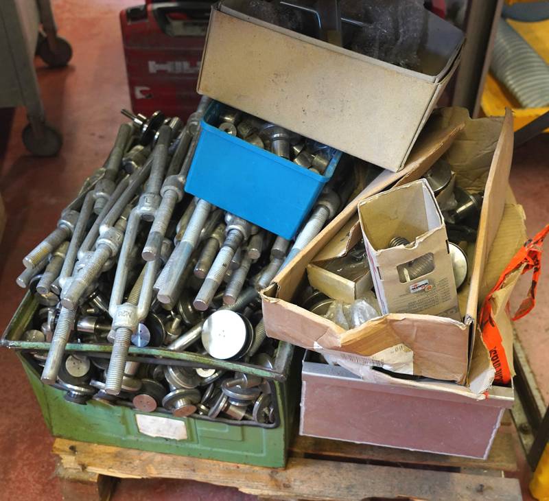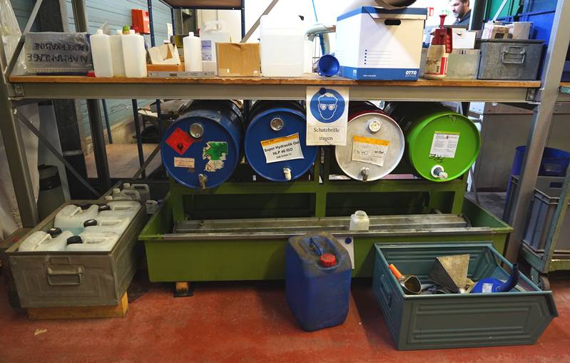 Regalinhalt Zwei Felder auf drei Etagen. Diverse Verbrauchsmaterialien in Fässern. Elektrischer Türantrieb mit Schienen etc.