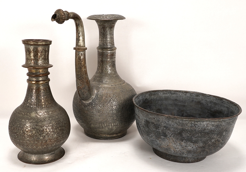 Persien 20. Jh. Metall. Eine große Schüssel, eine Karaffe und eine Kanne, jeweils mit ornamentalen Ziselierung. Durchmesser der Schüssel ca. 24,5 cm, Höhe der Kanne ca. 34 cm. Gewicht ca. 3,74 kg.